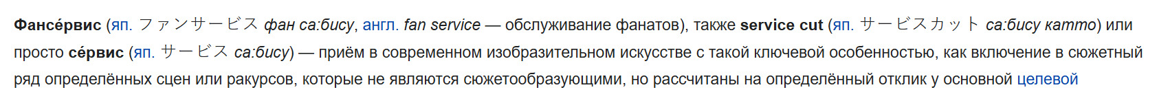 @margaretti, ну что за безвкусица Фансе́рвис (яп. ファンサービス фан са:бису, англ. fan service — обслуживание фанатов), также service cut (яп. サービスカット са:бису катто) или просто се́рвис (яп. サービス са:бису) — приём в современном изобразительном искусстве с такой ключевой особенностью, как включение в сюжетный ряд определённых сцен или ракурсов, которые не являются сюжетообразующими 1. Капелла - сюжетообразующий момент где она предстала перед Субару в маниакальной форме любви. 2. Лилиана и Присцилла - там так же как и в 1м сюжетообразующий момент. 3. Где ты тут фансервис увидел, там основной кадр на Регулуса идёт 4. Также сюжетообразующий момент где Капелла сыграла роль Присциллы. Сам кадр передает отвращение к иллюзии Капеллы, чем акцентирует внимание на фансервис Моргаретти, ты реально под стопариками смотришь аниме ? Остальные кадры так же лишены фансервиса, поэтому научись наконец смотреть не только на открытые участки кожи 15 летних девочек а и на сюжет.