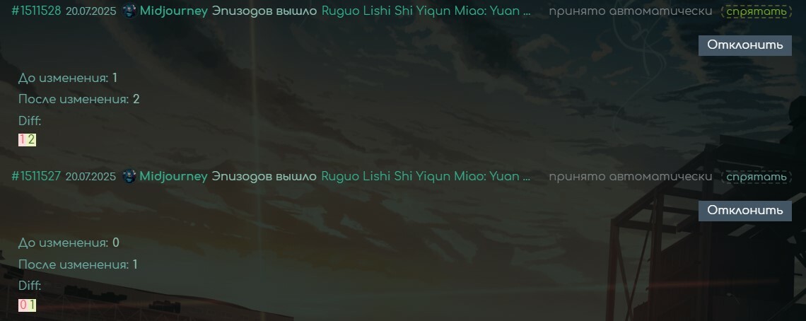 Что ж, набор модераторов всё же возымел какой-никакой эффект и половина журналов теперь заполнена. Даже многострадальный "Журнал изменений текстов". В связи с этим, приоритет набора во все журналы, кроме изменений фансаба и изображений, снижен до минимума. Однако теперь, кроме журналов, "появилась" ещё одна должность на которую было бы неплохо найти человека. Речь идёт о Trusted Episodes Changer, позволяющей взаимодействовать с эпизодами тех тайтлов, на которых они не обновляются автоматически. В большей степени это касается китайщины и корейщины.