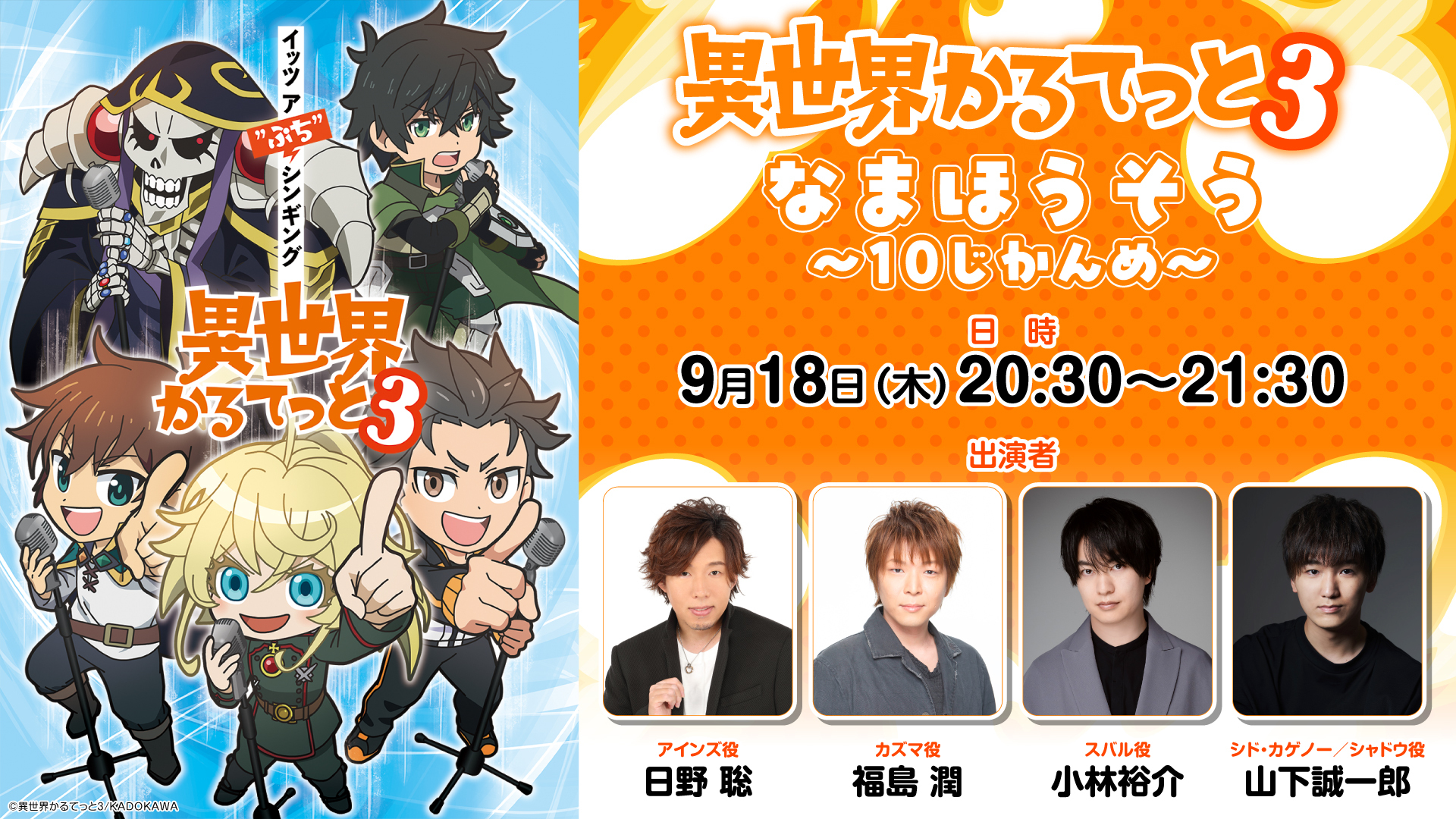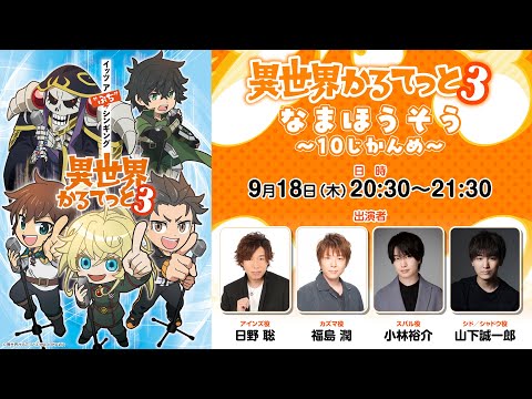@AdRum, 18 сентября 2025г. - Satoshi HinoСатоси Хино (сэйю MomongaМомонга), Jun FukushimaДзюн Фукусима (сэйю Kazuma SatouКазума Сато), Yuusuke KobayashiЮсукэ Кобаяси (сэйю Subaru NatsukiСубару Нацуки) и Seiichirou YamashitaСэйитиро Ямасита (сэйю Cid KagenouСид Кагэно) - представят новую инфу по Isekai Quartet 3Квартет из альтернативного мира 3:x.com/Rezero_official/status/1968623157444591854