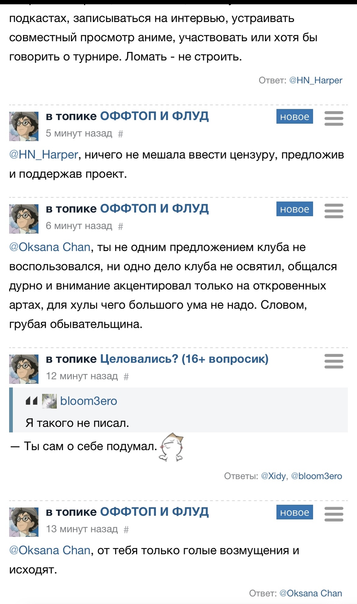@kolisya, он сейчас не только на меня кидается, если что:@Лизочек,@hot rain,@Aniki или др, модеры, можно какт это пресечь, плиз? Он меня оскает (называет клоуном и психопатом, сидящим на таблетках, мне неприятно) теперь и на другого юзера пошёл срываться@wh015,@kolisya,@Лизочек