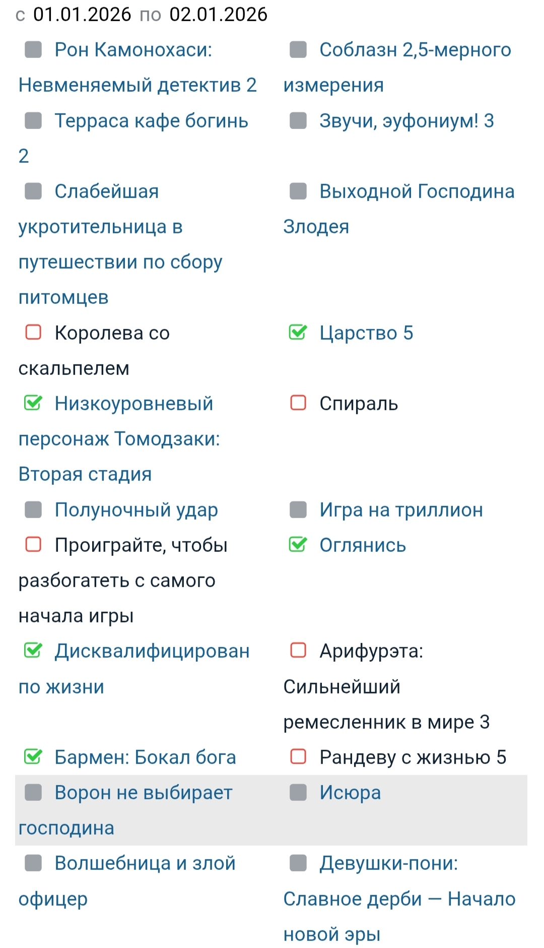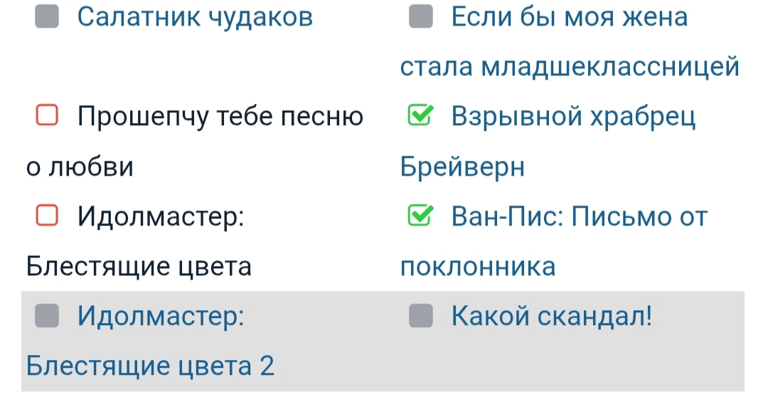 @Yakris, ну и слава богу, он должен быть в конце или в середине списка @Чамуски, Боюсь тебя расстраивать... @Aglo_DK, и тебя с новым годом!) По твоему выбору и в схожести с моим - 4 совпадения из 15... @Euclas3, опять они не могут понять, что лучшие исекаи - это Власть книжного червя, Полное исследование, Гримгал пепла и иллюзий, Двенадцать королевств и Скитальцы @Love Alina, нет,
