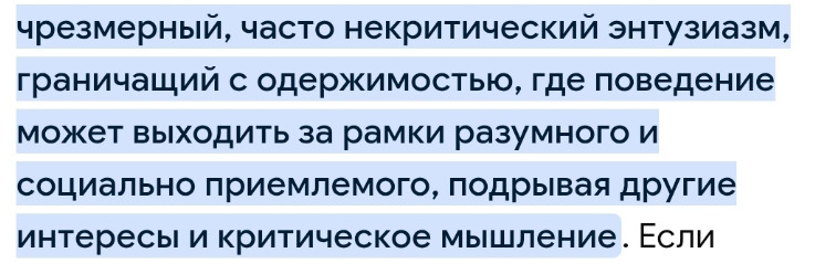 Фанат — человек, который сильно увлечён чем-то или кем-то (командой, артистом, идеей), активно поддерживает и переживает, но обычно сохраняет способность критически мыслить и контролировать своё поведение.