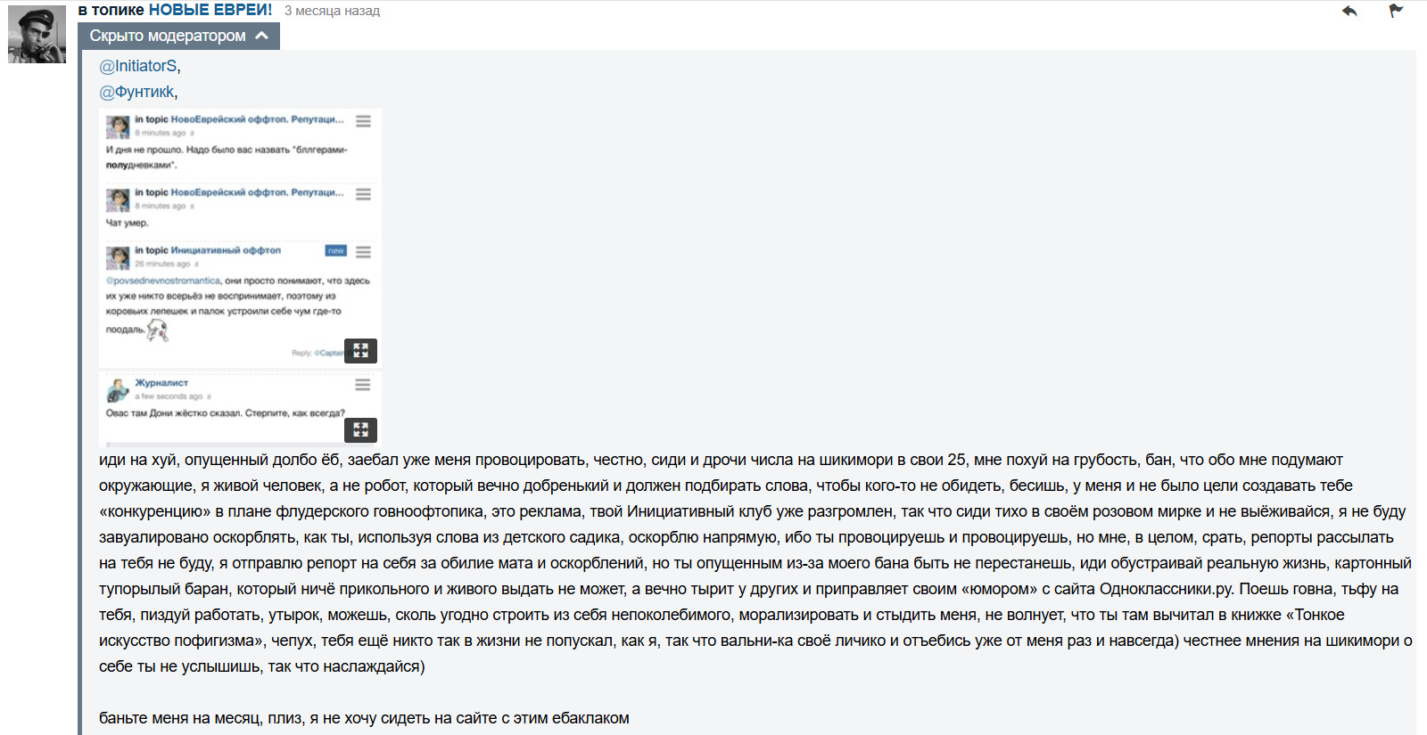 @puet, будет дан контекст того, что данный юзер до этого писал и на что моя эмоциональная реакция?) покажешь отзыв на врата штейна, где он оскорблял меня и участников моего клуба, создавал клуб с травлей моего клуба, писал о моём клубе, что у меня тараканы и жуки сидят, что мы умрём?
