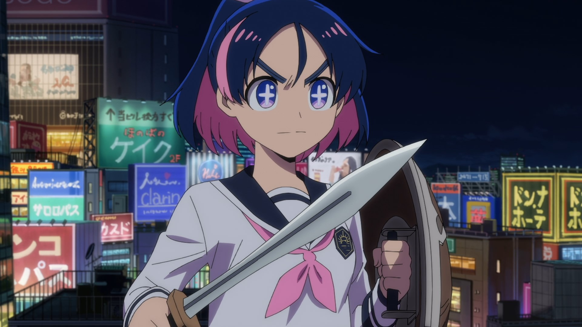 , "аниме стиль школьница с мечом кинжалом волосы карэ черно-розовый фон ночь японский город неоновые вывески"
