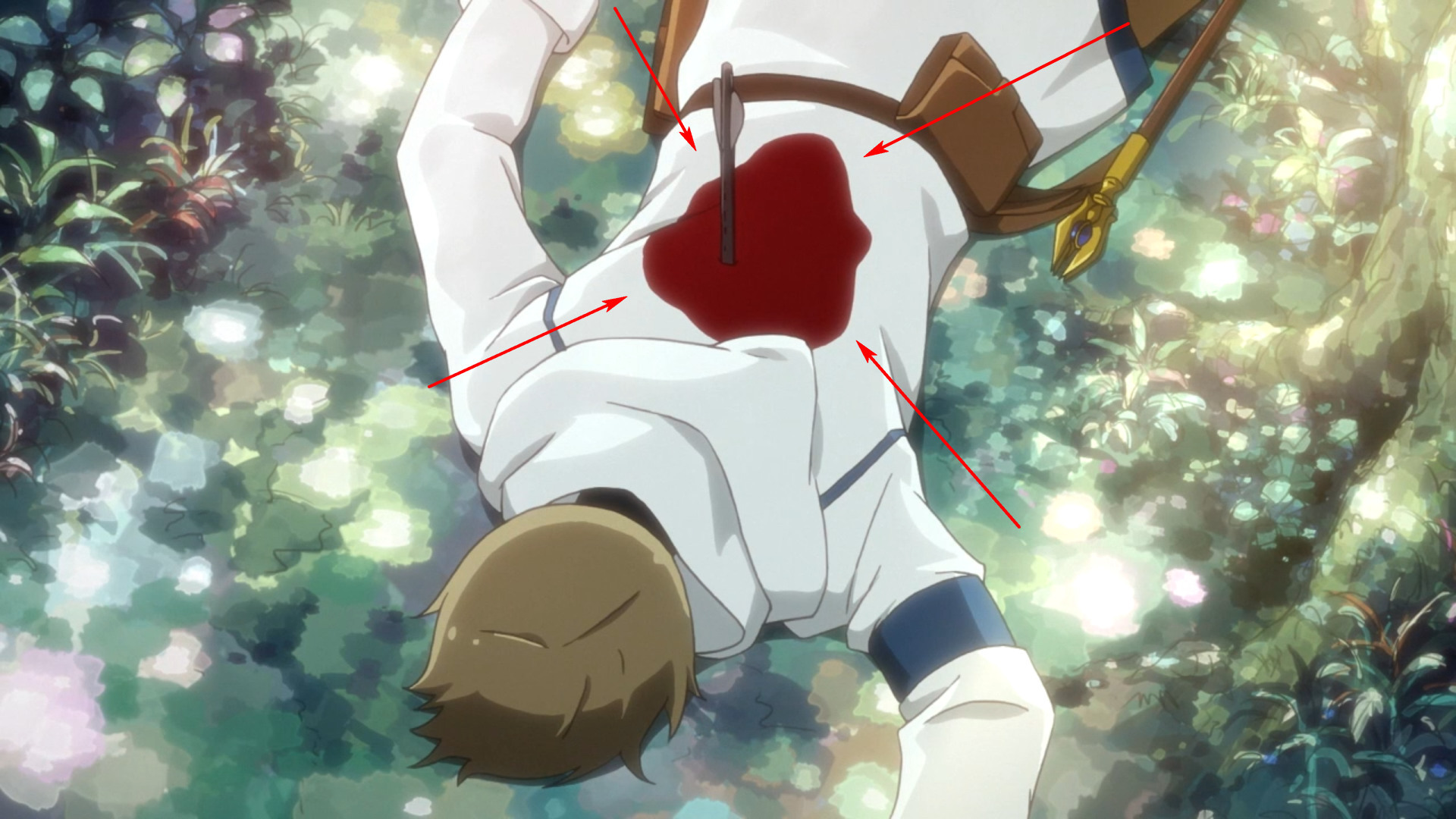 Это кадр в котором персонаж убегает после того, как ему в спину попали арбалетным болтом. И не смотря на попадание болт каким-то магическим образом испарился из его спины.А вот кадр, когда персонаж и его друзья наконец добежали до безопасного места. И о чудо, арбалетный болт вернулся на свое законное место!