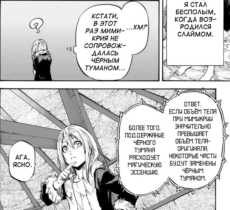 @FurryTiger, объём Римуру в форме слайма примерно 3-5 литров, объем детской формы - 30 - 45 литров, объем взрослой мужской формы - 65-85, т.е приблизительно в 2-3 раза больше детской. Если судить по информации предоставленной на скрине, во взрослой форме ему нужно тратить в два - три раза больше маны, что учитывая его имбовость не должно быть проблемой. Хотя в девятой серии говорится, что превращение в человека не вызывает черного туамна, который добавляет недостающий объем. Даже если имелась ввиду детская форма, использование взрослой формы не должно доставить проблем. В серии показали, почему он не выбрал тело взрослой женщины - Римуру посчитал это аморальным - но почему он не выбрал тело мужчины я так и не понял. Думаю, большинству взрослых будет комфортнее существовать в форме мужчины а не ребенка, что опять отсылает меня к вопросу о его фетишизме. Претензии у меняименно к личности гг. Может быть, став слаймом, он утратил ощущение себя как парня, а также значительную часть человеческого, в том числе эмоции, но за таки героем наблюдать не так интересно.