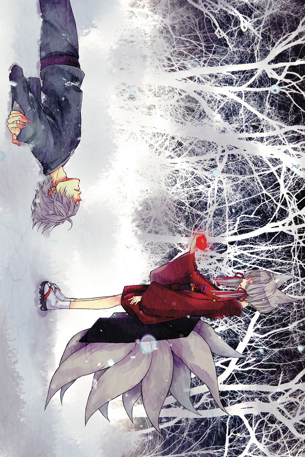 (уже восемью)хвостами, тепло и нежно оберегает нашего главного героя. У него слабое здоровье, нет никаких особых сил, он не похож на человека, но и не владеет способностями духов, и ему не позволено покидать территорию храма. Но однажды Мико сама даёт задание Юэ - пойти в город и познакомиться с двумя юношами, Акки и Цубаки. Юэ искренне радуется возможности завести новых друзей и вместе с Курогицуне отправляется искать мальчиков, которых почти единственных среди множества видит в облике людей. Однако настоящая задача Юэ не так проста: после того, как он познакомится с ними поближе, ему придётся выбрать, кто из мальчиков станет его "едой". Юэ всё это время жил взаперти и понятия "еда" или "человеческие чувства" ему неведомы. Так что случится, когда трое юношей станут достаточно близки?Вот, в общем, эта тайна и подогревала интерес на протяжении всего произведения. Тут были моменты, когда героям нужно было бежать, что-то делать, но они внезапно останавливались и рассказывали читателю о произошедшем... Это очень помогало понять историю, но выглядело, конечно, несколько глупо. Возможно, в новелле всё было не так? Ну, подать информацию всё равно как-то надо было.