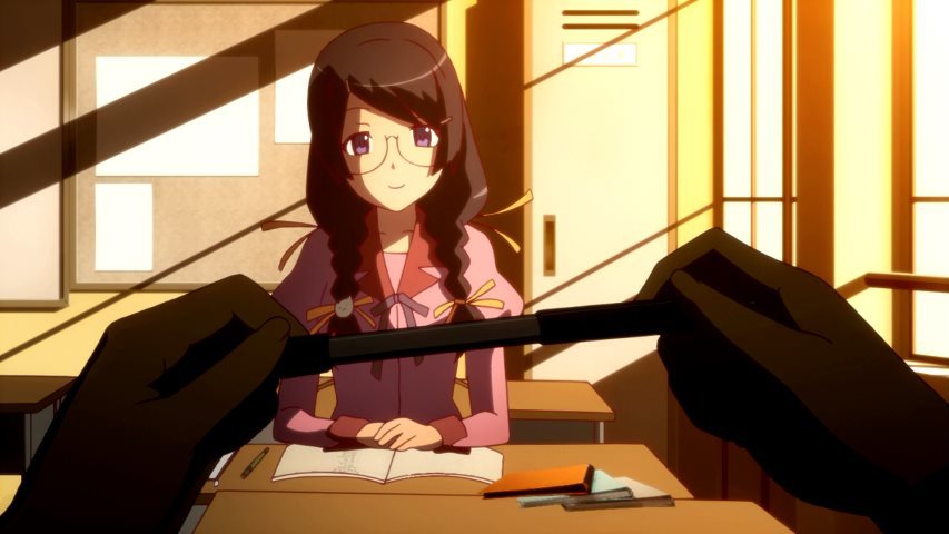 @Goliard, ОК. Начнем с этого кадра:Что означают темные предметы, заслоняющие Ханекаву? Это руки Арараги и ручка между ними. Нам показывают сцену глазами Арараги. И не только ее, повествование ведется от его лица. Да и поведение героя в значительной степени определяется тем, кто он есть на самом деле. Наверняка нам нужно представить нашего героя? В принципе, дальше можно уже не читать, я думаю, моя идея прозрачна.