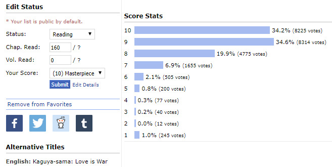 @Stannis, да че то как-то не, некоторые тайтлы уже месяцами в такой ситуации и ничего не происходит. Особенно это касается манги, где мало оценивших, так что даже 100-200 ботов могут опустить оценку на 0.5-1 балл, что вполне критично. Это манга Кагуя-сама. У нее несколько месяцев назад была оценка 8,86 и она только росла. Но потом резко начала падать, и сейчас она составляет 8,80. И пока ничего не происходит. С аниме проще, там можно количеством задавить так, чтобы не видно было. Чихаяфуру же...
