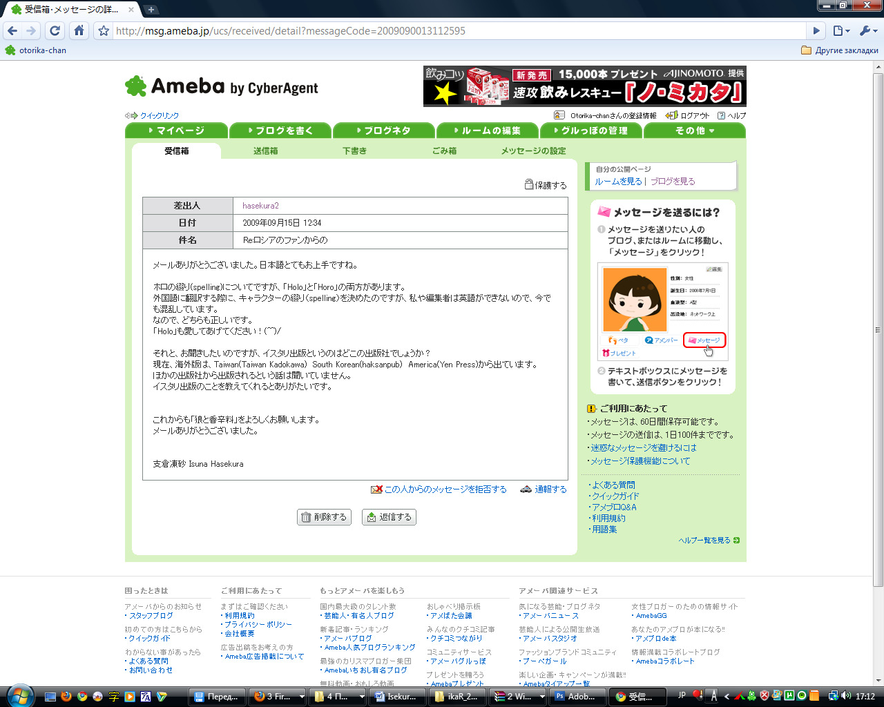 Спасибо за ваше письмо. Вы хорошо говорите по-японски. Что касается транслитерации имени, есть варианты «Холо» и «Хоро». При переводе на другие языки мы должны решать, как будет записываться имя персонажа, но так как ни я, ни редактор иностранных языков не знаем, возникают подобные затруднения. Могу сказать только, что оба варианта правильные. Пожалуйста, полюбите и «Холо»! (^^)/ У меня есть к вам вопрос: «Истари» — это издательство какой страны? Я знаю, что за рубежом «Волчицу» выпускают в Тайване, Корее и Америке, но о других не слышал. Расскажите поподробнее про это издательство, если вам не трудно. Читайте «Волчицу и пряности» и дальше. Ещё раз спасибо за письмо.