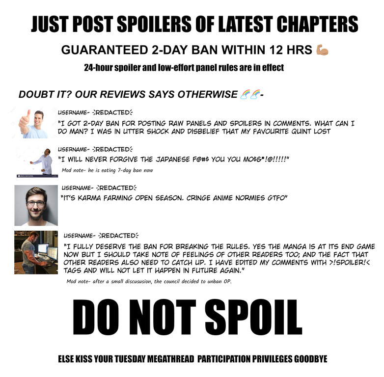 @KotikDA, я видимо слишком избалован всякими реддитами, где на сабреддитах любой более-менее крупной манги спойлеры сразу удаляются, спойлерасты сразу банятся, а любое обсуждение манги держится только в одном треде в течение 24-48 часов после выхода новой главы на английском. А так есть и спойлер тред и тред, обсуждающий спидсканы итд. Так же работают и дискорд серверы по разным мангам. Ну а так "все и так знают, что сюда лучше не соваться" - то это уже какой-то виктимблейминг