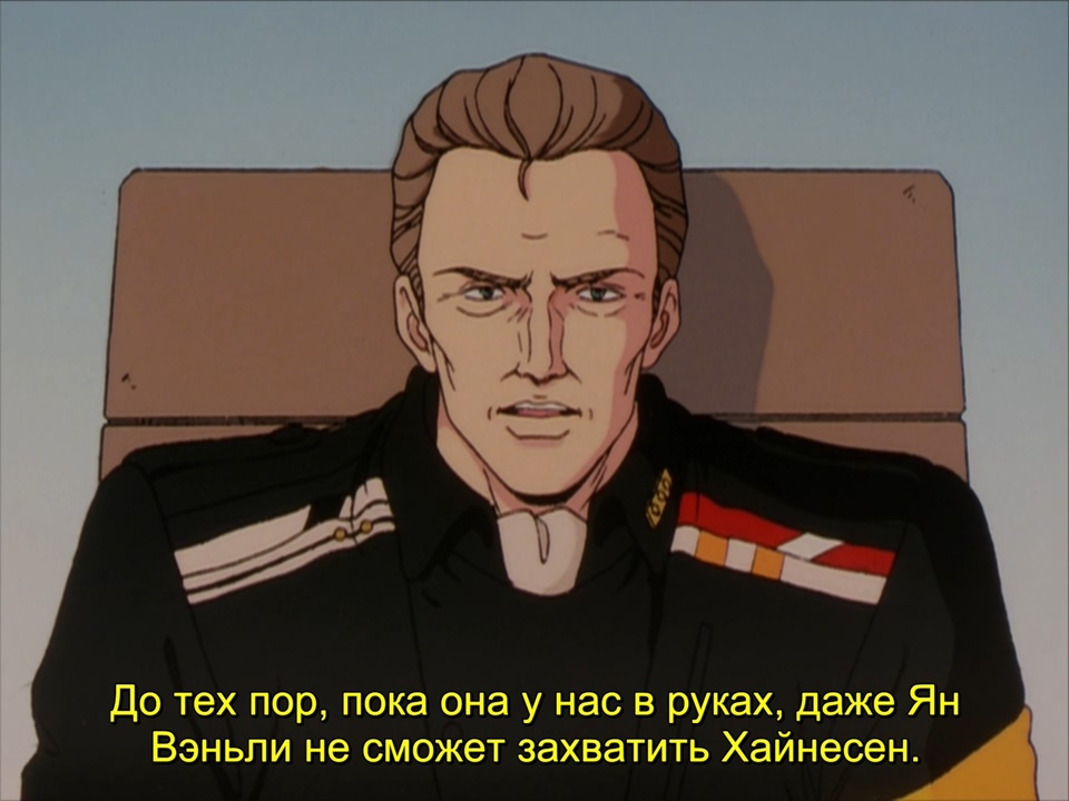 А в Империи к бищику вернулась его совесть. Она у него, как известно, рыжая, самоходная и флотом командует. Вообще, им пора бы уже преодолеть предрассудки и заключить официальный брак. Во всяком случае, Кирхайс полощет мозги Лоэнграмму так, как будто они женаты уже лет десять. Чувствуется наработанный навык. А причина — в рефлексиях по поводу того ядерного удара, к которому, как нам явственно повествуют уже во второй раз во флэшбеке, бищик не имеет никакого отношения вообще и чего он так страдает — непонятно, видимо, нужно было срочно накатить драмы из ниоткуда. Красноглазик, как обычно, пытается вправить мозги внутри белобрысой головы, резонно замечая, что не стоит назначать кого-то любимой женой, но чувства бищика слишком сильны. Они — одно целое, но не могут быть вместе — это так романтично!