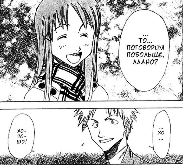 Самое интересное, последняя фраза воспринимается в Японии как приглашение на свидание, в новелле Ичиго практически идентичной фразой пригласил Орихиме.