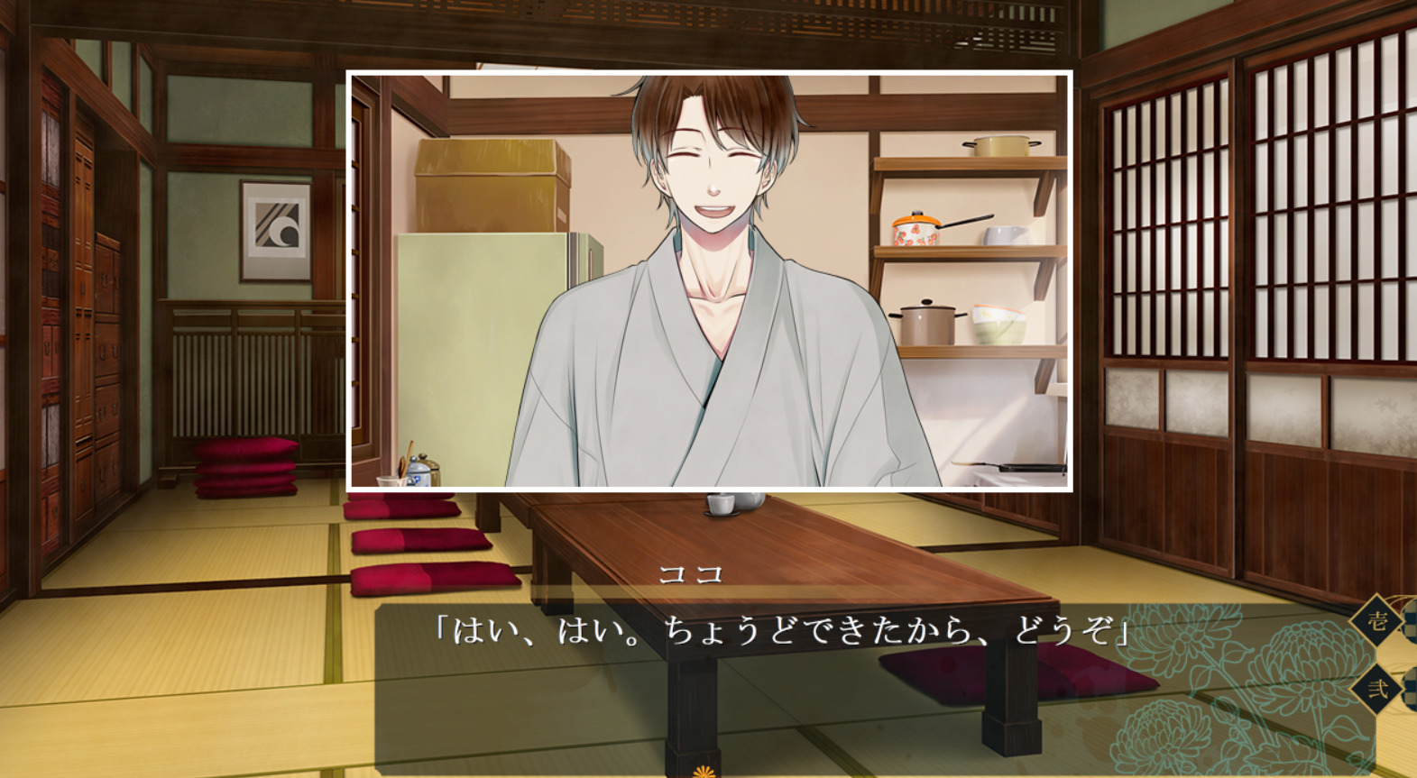 Изменение "кухонного окна". Грубо говоря, кухню и столовую кроме двери разделяет ещё окно, и раньше оно изображалось, как на первой картинке — продолговатой полосой. После обновления специально для сцен, когда Хисора смотрит на кого-нибудь на кухне из столовой, этого персонажа помещали в настоящее "кухонное окошко" Х) Первый вариант, кстати, всё равно остался в некоторых других сценах — изменениям подверглась только кухня.