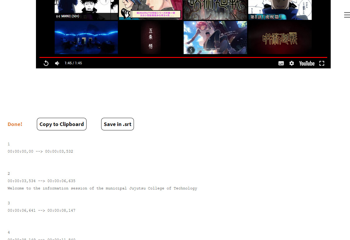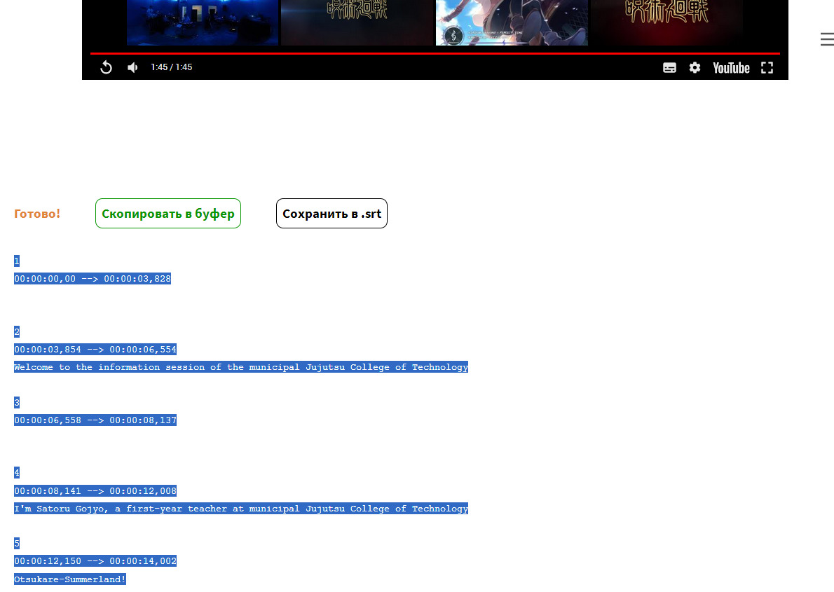 ВАЖНО! Пока видео не доиграет до конца и скрипт не доработает, нельзя переключаться между вкладками браузера, текущая должна быть открыта всё время. Иначе не будет строк и/или (корректного) тайминга. Но можно в это время сидеть в другом браузере, в видеоплеере/фотках/документах/другой проге, главное, чтобы вкладка с видео не переключалась на другую с первой до последней секунды. В принципе, это не проблема, когда садишься всё равно смотреть очередную видяху на том сайте - пока посмотрел, скрипт отработал.