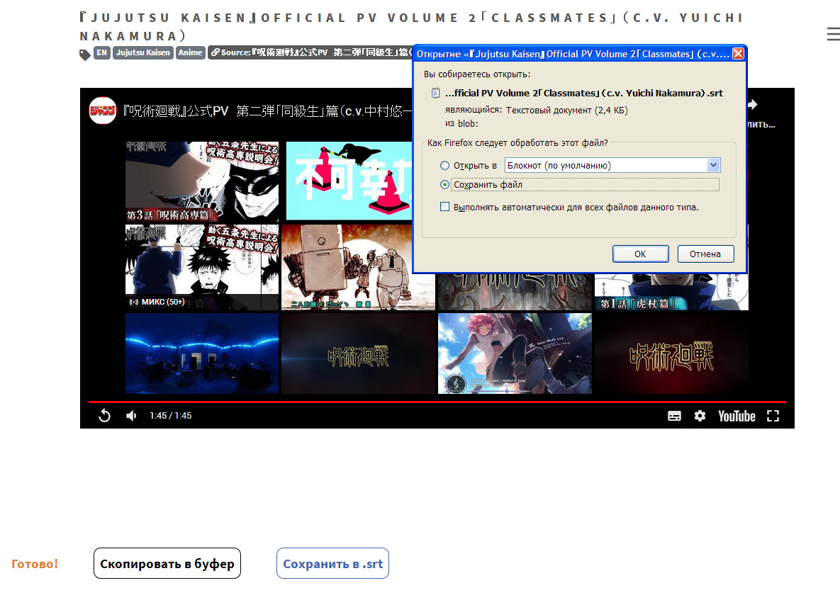 Вторая кнопка предлагает сохранить все эти строки на комп сразу в виде .srt-саба. Название файла подхватывается по названию страницы с видео, при желании - меняем