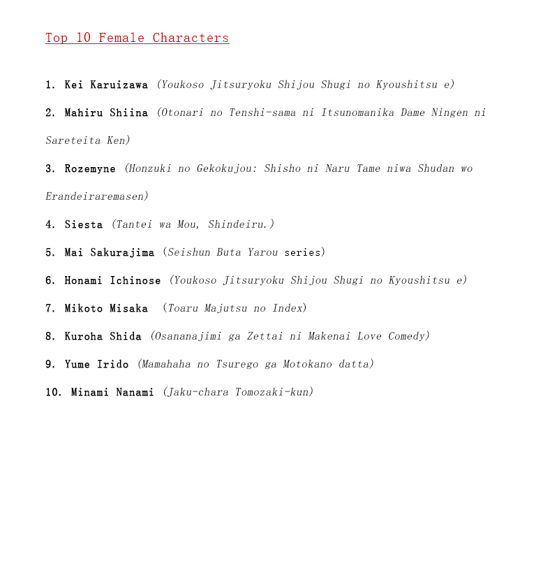 twitter.com/RanobeSugoi/status/1329817718606888962 1 - Kei Karuizawa - Classroom of the Elite 2 - Shiina Mahiru - The Angel Next Door Spoils Me Rotten 3 - Rozemyne - Ascendance of a Bookworm 4 - Siesta - The Detective is Already Dead. 5 - Mai Sakurajima - Seishun Buta Yarou 6 - Honami Ichinose - Classroom of the Elite 7 - Mikoto Misaka - To Aru Majutsu no Index 8 - Kuroha Shida - Osananajimi ga Zettai ni Makenai Love Comedy 9 - Yume Irido - Mamahaha no Tsurego ga Motokano Datta. 10 - Minami Nanami - Jaku-Chara Tomozaki-kun