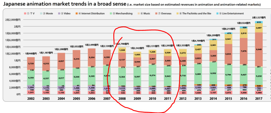 А вот тут не прав кардинально Например 2008 кризис сильно повлиял на анимеиндустрию в том числе из-за того, что количество закупок лицензий с запада уменьшился. Западный рынок всегда был важным для Японии На графике это падение скромно выглядит, но ситуация была тяжелой (хотя ладно, надо просто без пачинок смотреть, тогда будет понятно)