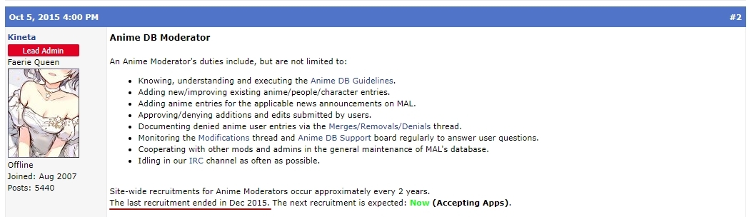 Да они наверняка есть, только вот никакого набора в модераторы базы аниме не было уже чёрт знает сколько (на MALе этот процесс строго регламентирован):