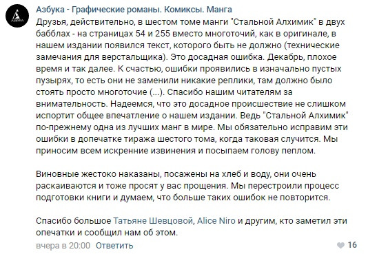 А ну ка опытный в группе юзер приведи-ка в пример сравнимый с Бездарями косяк, в котором в книге пропущена целая страница, с которой вставлен листочик с "простите я обосрался", или может знаешь пример, где вставлена целая глава из другой книги? Что в такой ситуации делает XL? Отзывают тираж. Что в такой ситуации делает Клоунич? "Извините-простите, поймите". Что делает Альтграф когда книга на 2мм выше другой? Отзывает тираж и дает купон на 300р всем, кому пришел брак. Что в такой ситуации делает Клоунич в НЧ? "Да всё нормально чо вы, будьте благодарны ваще". А если вспомнить как он кинул яойщиц, которые ему 16кк насобирали, где фандом до сих пор кострыы жжет? А если вспомнить как он 3 года назад аниме лицензировал, а потом по судам бегал закрывая всех, кто это аниме задолго до его лицензии перевел, вот только Кловенич ничего так с этим аниме и не предоставил. Где справедливось спрашиваешь? Тебе повторить нужно?