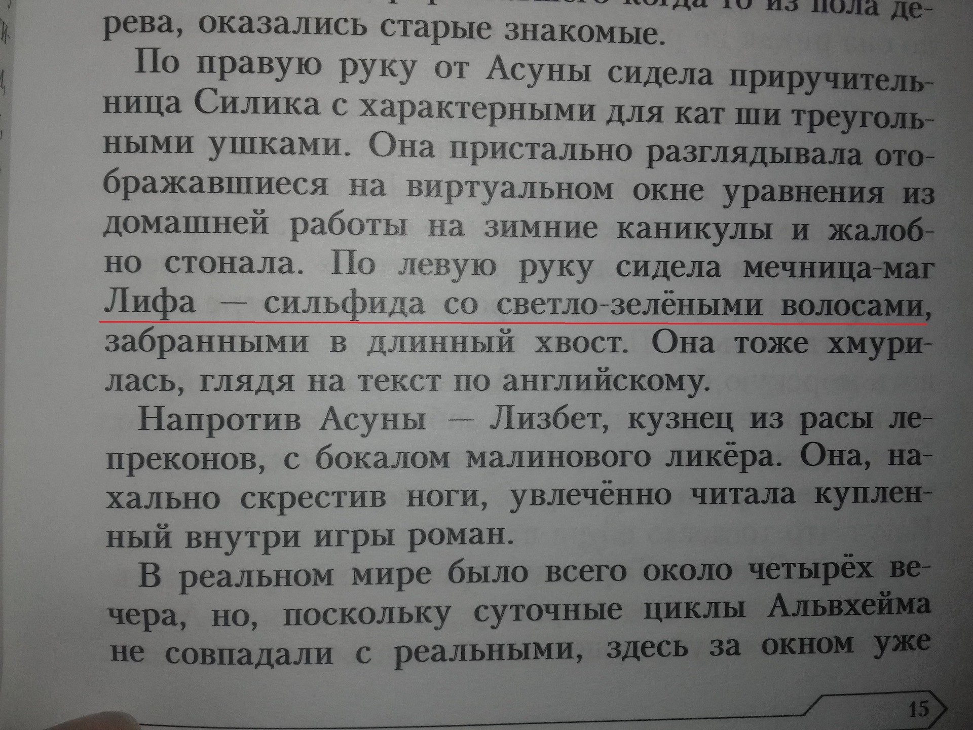 нет, я сделаю это сам. Не утруждайся. Само собой я делал вывод не по одному предложению, лол, я же уточнил, что это всего пара скринов, потому что всю книгу я разбирать не хочу. Вот тебе вдогонку и второе фото из двух, а заодно и сама Лифа на всякий случай Так вот о чем говорят эти примеры: переводчику совершенно непонятно то, что он переводит, как раз именно это и похоже на гугелперевод, потому как любому недауну очевидно, что слово "мечник" не означает игрока в САО априори, если ты не выделишь это кавычками, ссылкой или хотя бы курсивом. То есть челик на полном серьезе писал про чувачков с мечами и эльфов, и никто из редакторов конечно же не обратил внимания просто потому что вообще не понимают о чем речь, как собственно и то, как выглядит светловолосый зеленоглазый персонаж который есть в том числе на цветных картинках с ссылкой на то, что это конкретно вот этот персонаж собственно вся книга полна таких тупых моментов, что наглядно показывает насколько насрать на сабж как переводчику, так и редакторам, они просто пускают через транслитор и делают из этого подобие литературного языка. Уверен, ты не сравнивал перевод этой шаражки с альтернативными вариантами, и просто так отстаиваешь этих клоунов "потомушто ты ни ниадыкватный хейтир"