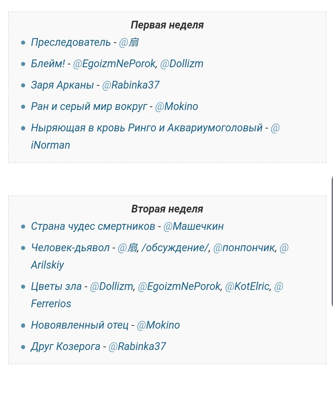 Chimoguri Ringo to Kingyobachi Otoko прочитано. Когда мне было двенадцать рисовал комиксы и писал рассказы, и даже заразил энтузиазмом к такого рода времяпрепровождению нескольких тогдашних друзей. Придумывали невероятные абсурдные истории, совмещая их с переиначиванием наших любимые дурацкие фэнтезийные книжек. Chimoguri Ringo to Kingyobachi Otoko словно придумана таким же школьником с богатой фантазией, только источником вдохновения была сёнен манга. Понять это можно уже из синопсиса: есть Аквариумоголовый человек, появляющийся около воды, если у кого-то пошла кровь, и превращающий человека в рыбу, противостоят ему ныряльщицы - девушки в школьных купальках, с револьвером на шее и сачком в трусах, цель которых "нырнуть" в человека до того, как он превратится в рыбу, и предотвратить превращение, и есть Ринго - обучающаяся стать настоящей ныряльщицой с лицензией. Манга пропитана глупейшим наивным абсурдом, автор набрасывание все свои фантазии на бумагу, без переживаний о том, как будет развиваться история дальше. Но всё так по-детски непринуждённо и искренне, что ругать мангу попросту неуместно. Вы ж не будете отчитывать двенадцатилетнего мангаку? Да, по факту ему под тридцать, но его эти ваши факты не беспокоят, ему лишь бы веселиться. Кто-то бы его упрекнул, я лишь позавидую. Могу посоветовать мангу как лёгкое чтение для уставшего мозга, или, скажем, для чтения в дороге. События развиваются динамично, скучно не будет. Только имейте в виду, что концовки нет. Есть вторая часть, но единственный на неё отзыв на шики не обнадёживает.