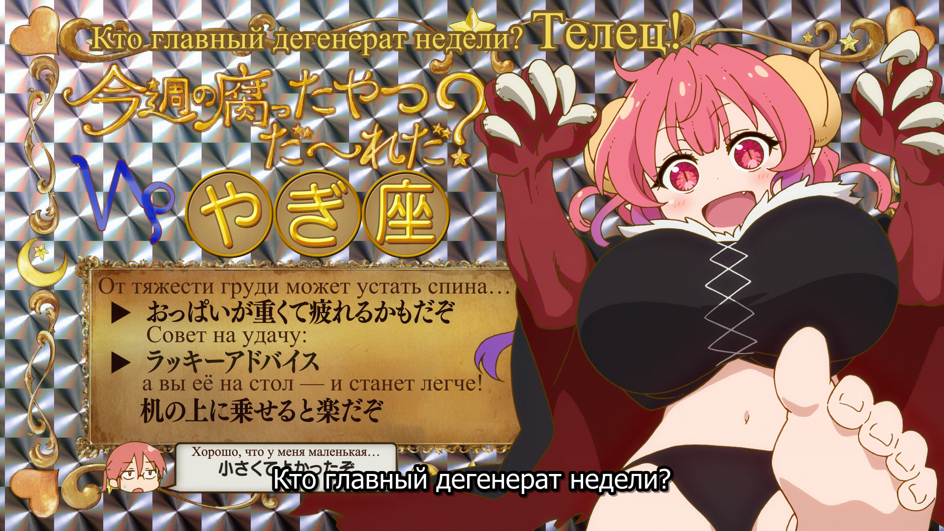 @asdfasdf, На этой неделе "Кто неприятный" (или как Rotten переводят, но дегенерат слишком грубо как по мне в сабах)"? Козерог (грубая ошибка в сабах, так как Телец тут не при чём) -Ты можешь устать от тяжелой груди (откуда взяли спину в сабах не знаю). -Удачный Совет Это помогает отдохнуть им на вашем столе (не совсем правильно перевёл как по мне. Но всё же, в сабах просто адаптировали по своему предложение, почти по смыслу подходит). -Я рада, что у меня маленькая. По идее, самая грубая ошибка для меня, что знак зодиака перепутали. Остальное более менее терпимо.