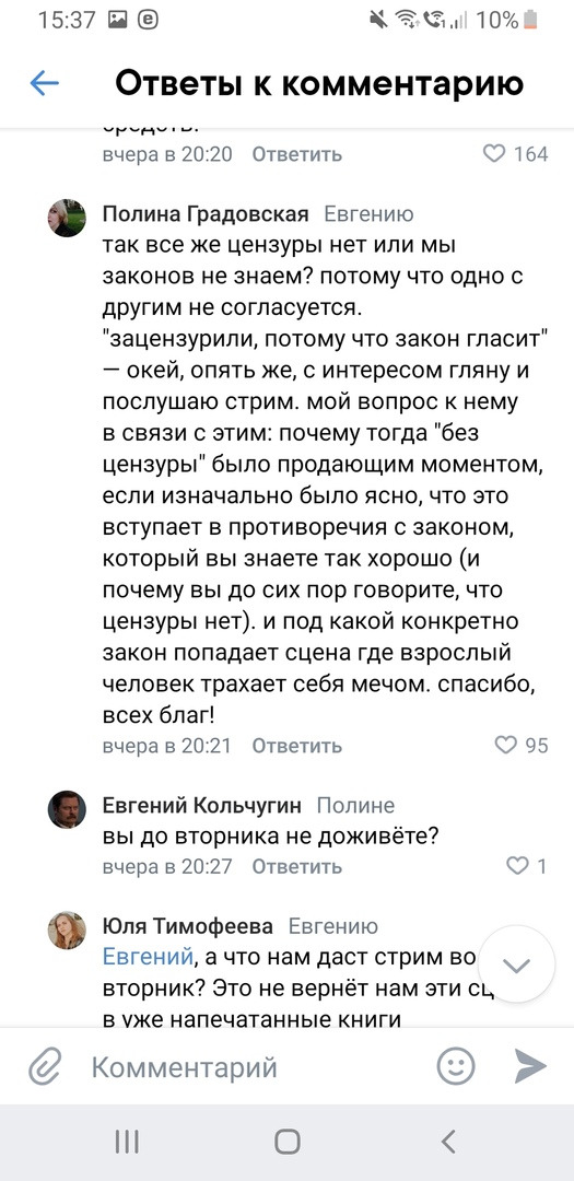 @Chiru, Кроме траблов с доставкой, о которых уже писали все, кому не лень, людей напрягло то, как на бумстартере обещали романы без цензуры и со всеми экстрами, а в итоге: "Мы не цензурили, а просто убрали запрещенный законодательством момент" Нет, это же не цензура! И плевать, что стоит плашечка 18+.