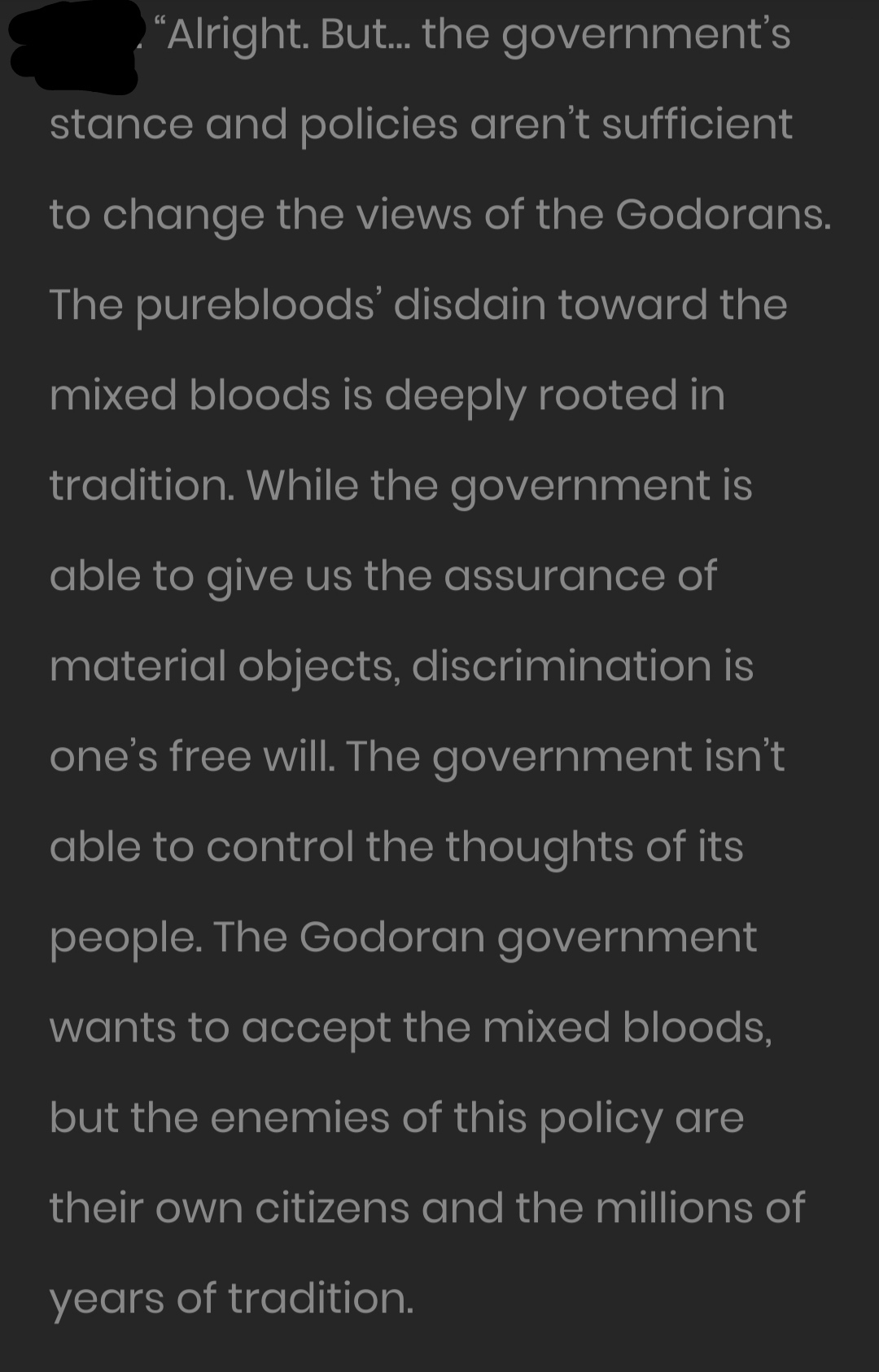 @Chabii, мне так нравится эта история, на удивление Столько хороших мыслей проскакивает.. Во втором эта фраза, что "discrimination is one's free will" меня задела очень.. так точно сказано.. Действительно, не заставишь никого изменить свои взгляды.. даже охотники на ведьм верили в свою правоту..