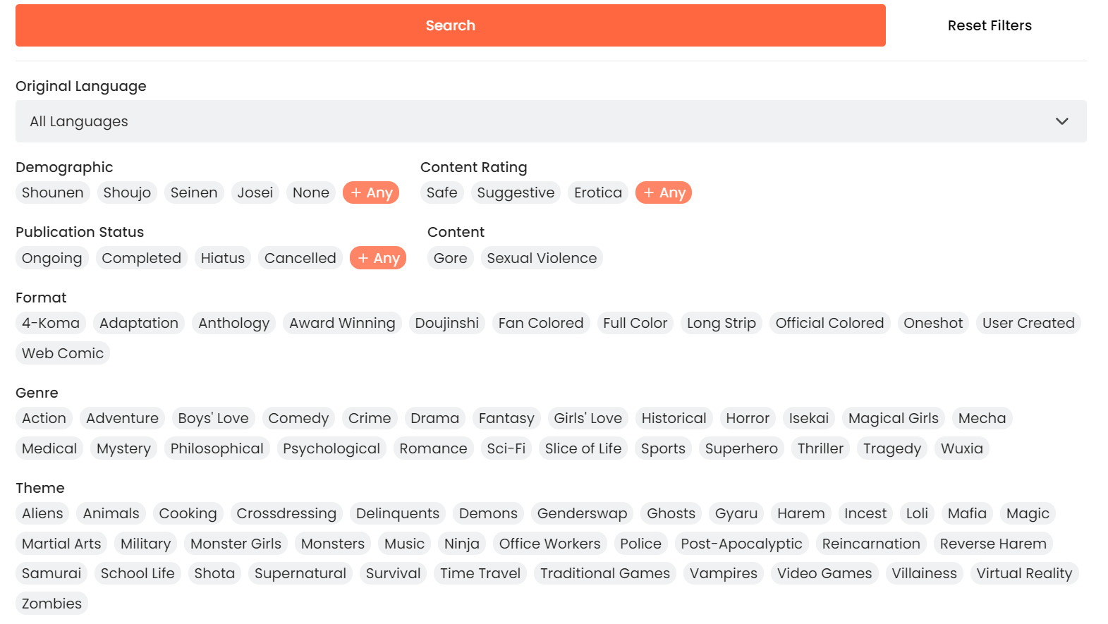 На мангадексе разделение неплохое, как по мне. Нам столько тем не нужно, конечно, и некоторые форматы тоже. Но в принципе мне нравится, как сейчас у них всё аккуратно расставлено.