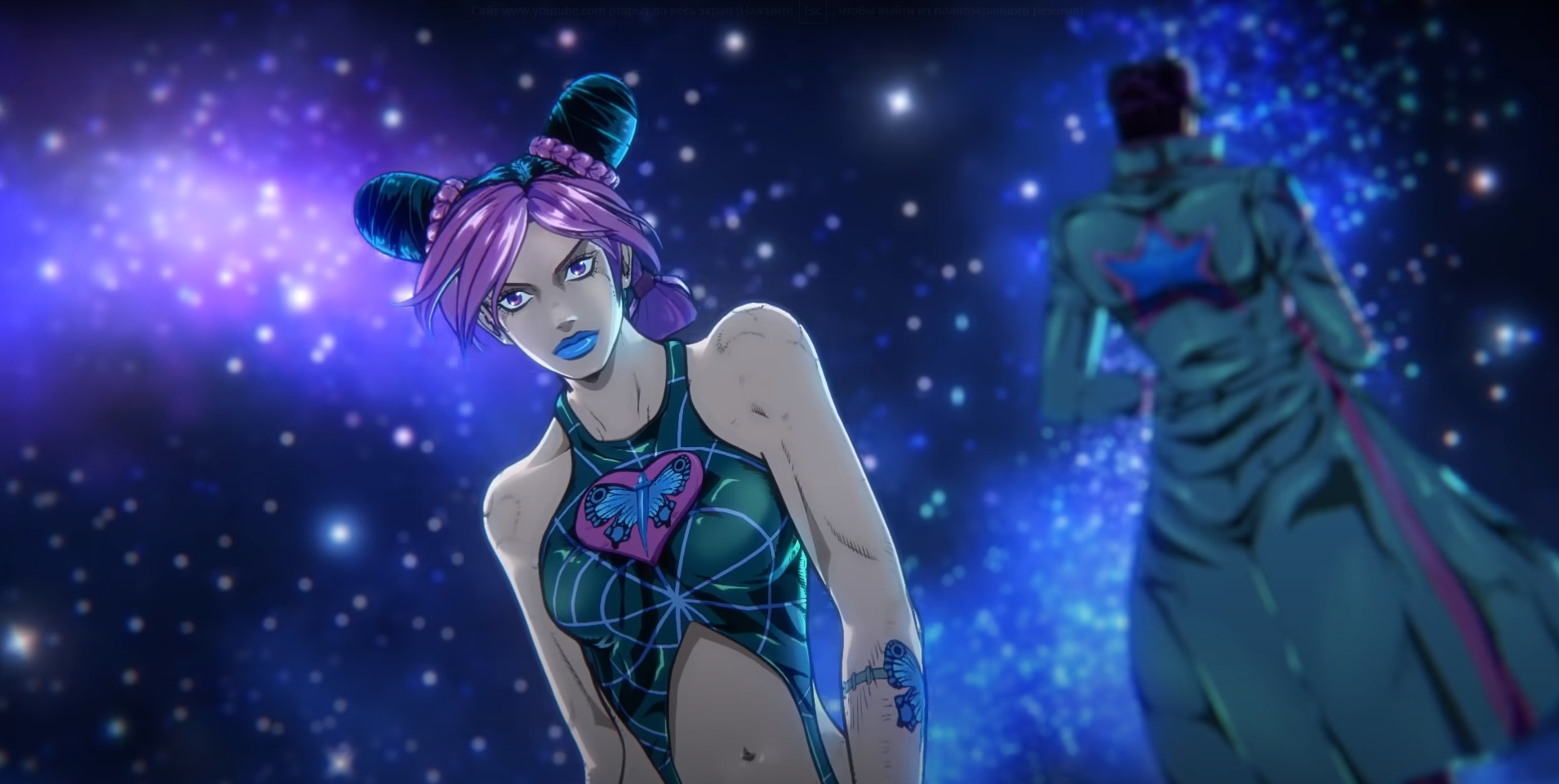 А на самой бабочки написано слово "Pray", что переводится как "молиться". Мало того, что символизм, так еще и олицетворяет то, что джолин искупает свои поступки прошлого и спасения отца. Я это так понял. Так еще и в самом финале, Пуччи получит рану именно от этой руки Джолин, что повлияет на исход!