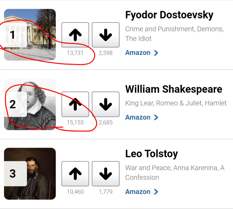 @MaybeNextTime, дружище, эт вапще как? Странная система у них там.Кстати, на том же сайте нашел голосовалку The Best Novels Ever Written. Мем в том, что люди, считающие их лучшими писателями, не голосуют за произведения этих лучших писателей. Они там в топ-20 максимум (Преступление и наказание).