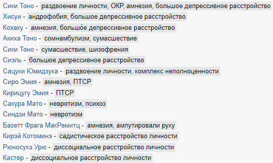 Я бы сказал, что у Шики ещё есть гематофилия, ведь он не раз возбуждался от вида крови, но это не совсем психическое расстройство. Это сексуальная девиация.