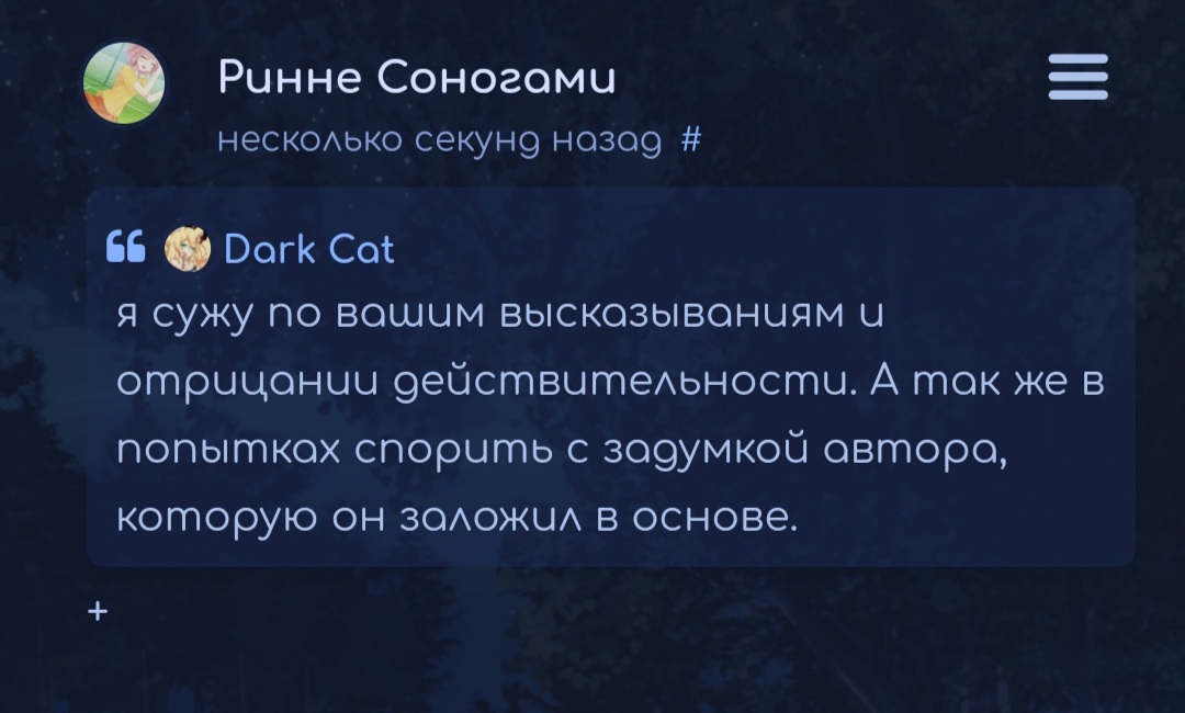 @Ринне Соногами, проблема в том, что тебе больше двух аниме глянуть надо, чтоб мнение учитывалось. Если человек говорит, что тень - это не гаремный исекай, не стоит ему этим заниматься, ей богу@Психоморфозис гей