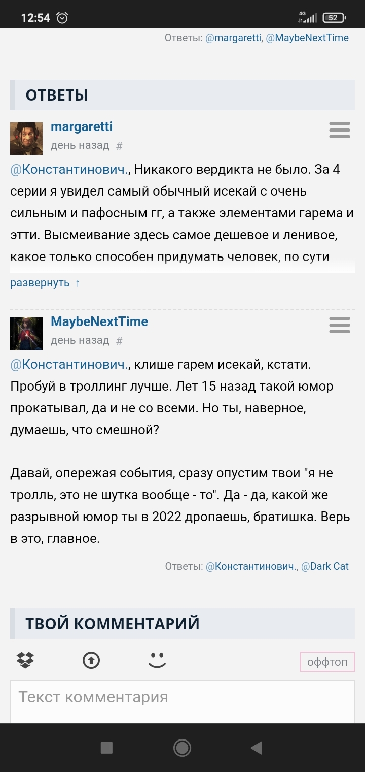 @MaybeNextTime, я уточнила что мне все равно на свое мнение, но так уж вышло что мне не все равно, когда люди творят дичь касательно других. Моя точка интереса была, когда задели другого человека (незнакомого мне причем) за то что он просто высказал свое мнение. Заметь тебя никто не тегал, но ты сразу полез без аргументации в общение