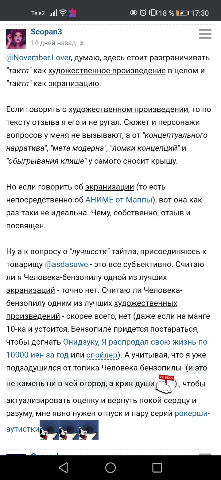 @муррейни, Уточнение: под каждым отрицательным отзывом с новым поносом в сторону маппы и бензопилы и топиком, под которым уже насрали хейтеры. Да и я че-то такого не видел, кроме одного коммента о шедевральности пилы под отзывов от фаната, который даже написал минусы экранизации.
