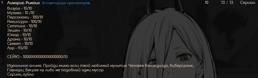 Да, возможно ты видел мои стычки в негативных отзывах в некоторых местах, но это всё ради рофла, потому что люблю попинать таких "ценителей", которые ещё позволяют себе новинки сравнивать с теми тысячами аниме, которые они когда-то видели. Это просто тупо и неуместно.