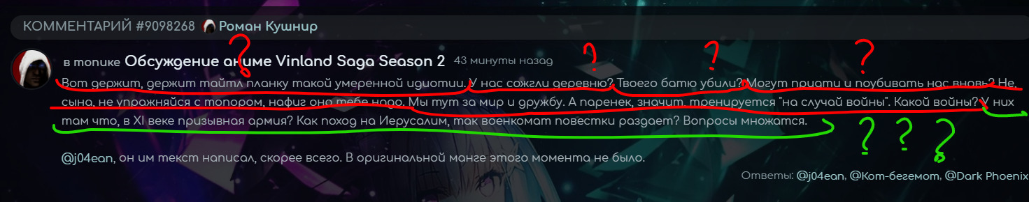 @Кот-бегемот, наверное, для того, чтобы понять сакральный смысл написанного следует посмотреть тайтл, в топике обсуждения которого мы находимся. Вроде несложная логика, а ты говоришь у тебя с ней все окей.@Кот-бегемот,@Норк Деддог