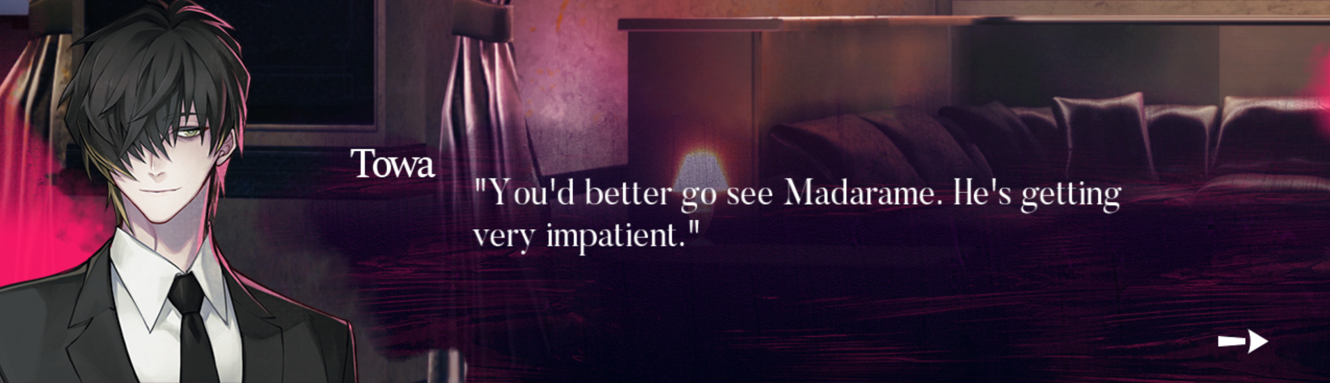 Чтооо, мы перешли сразу на Мадараме?? Интересно. Я думала, он будет последним персонажем. Но кажется, нам обязательно его нужно следующим проходить. Хм. Это чтобы покопаться в прошлом Товы, да? Вроде как у них есть общая история. И сейчас Мадараме считают погибшим. Возможно, он - тот самый "призрак", которого упоминали на руте Таку.