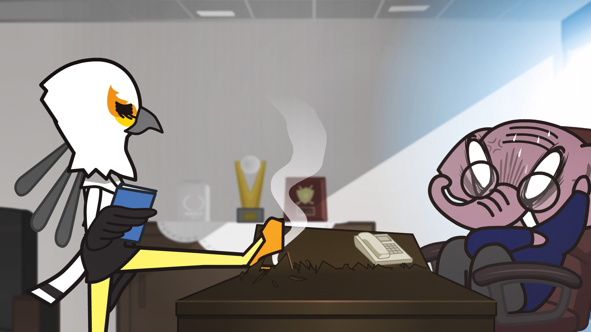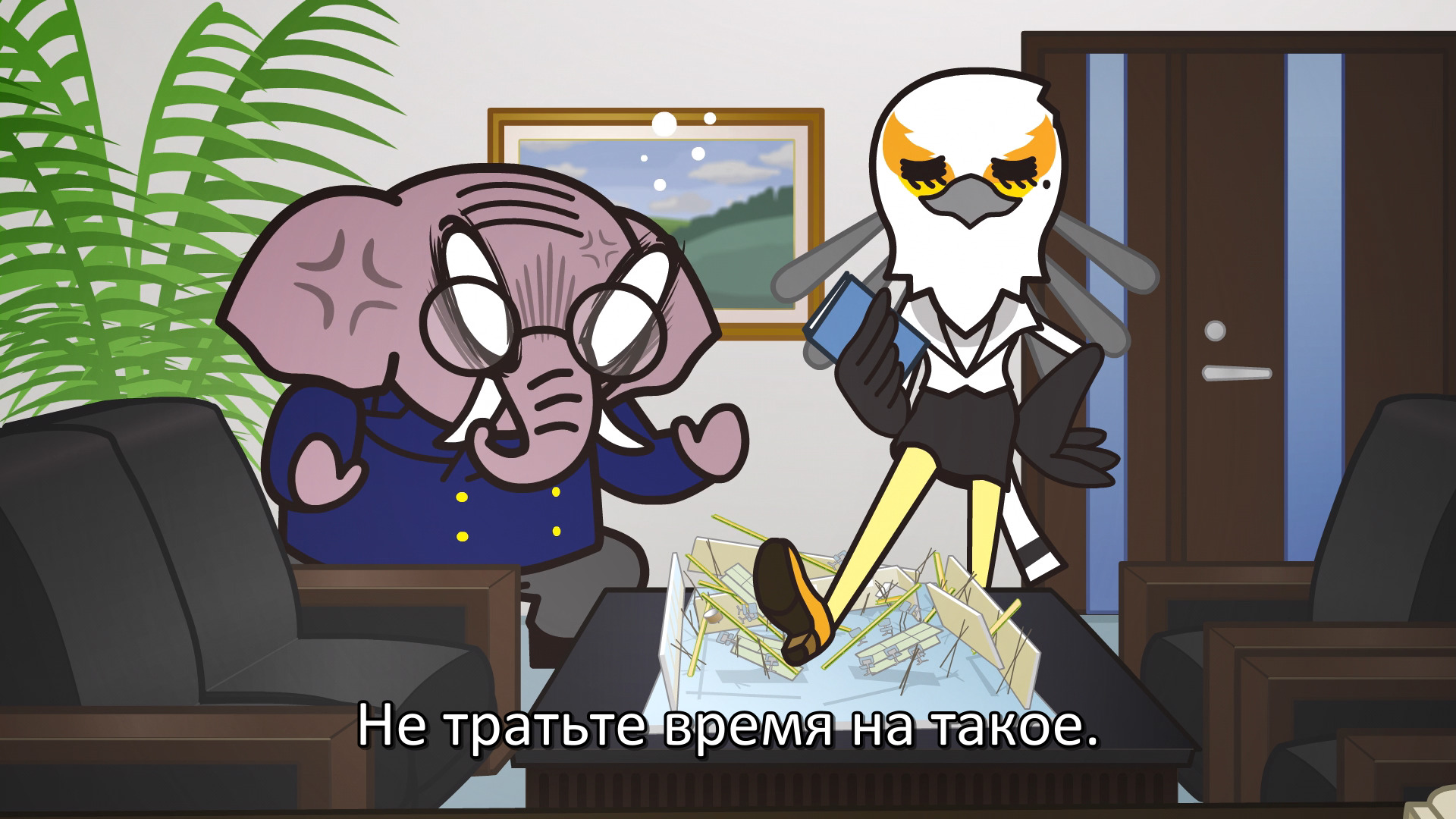 Феннеко мой внутренний тотем с прекраснейшим смехом. Ее манера мышления и просто речь - о да. Хайда в сравнении с тв версией стал довольно... значим персонажем, больше раскрылась дружба офисной троицы. Суррикат стал острым подхалимом начальству, Цунода такая же подхалимка, что не скрывает этого (из просто глупой модницы она превратилась именно в хитрого и расчетливого козлика). Теперь для меня довольно интересный персонаж - Директор Тон. Шовинист, бездельник и просто уповается властью. Хочется сказать по первым сериям, однако оказывается более глубоким персонажем, который является жертвой поддерживания баянистых шуток на почве пола, но при этом довольно расчетлив и видит своих подопечных очень хорошо, до какого момента на них можно давить и когда их глупые душевные состояния мешают общему фону работы. Его отношение к отделу и своему делу на самом деле не такие мелочные. У меня были такие.. знакомые, один принимал отчеты по практике, второй щас работодатель, и если их совместить (дотошная педантичность с отсутствием толковых пояснений задания от слова "вообще" и мемы над девушками), то будет директор Тон. Их можно понять, где-то пропустить мимо ушей, ибо людей не переделать. Всё же под слоем этой грубой корки спеси скрывается человек (ну или свин), готовый научить и подсказать. Но его не переделать. И иронично - Тон ведь признает Рэцуко, но от мемом по половому признаку никогда не откажется. Рисовка стала более плавной и, что забавно, детальной, тона и задний фон постоянно цепляли взгляд. Отдельно хочется сказать про осты: 10/10 ставлю каждому, надо будет потом скачать отдельно. Они были в тему и каждый раз оттеняли ситуацию, отвлекая некоторый объем внимания на себя.