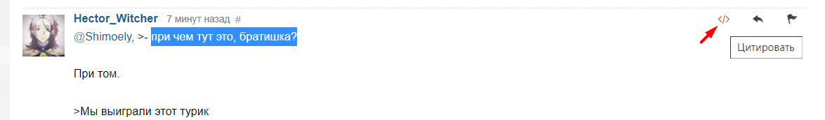@Cecilus_Segmunt, чтоб удобнее было увидеть на что ты отвечаешь другому юзеру (цитировать его тобишь), можно выделить его слова и нажать так, как на картинке: (прост без этого диссонанс дикий)