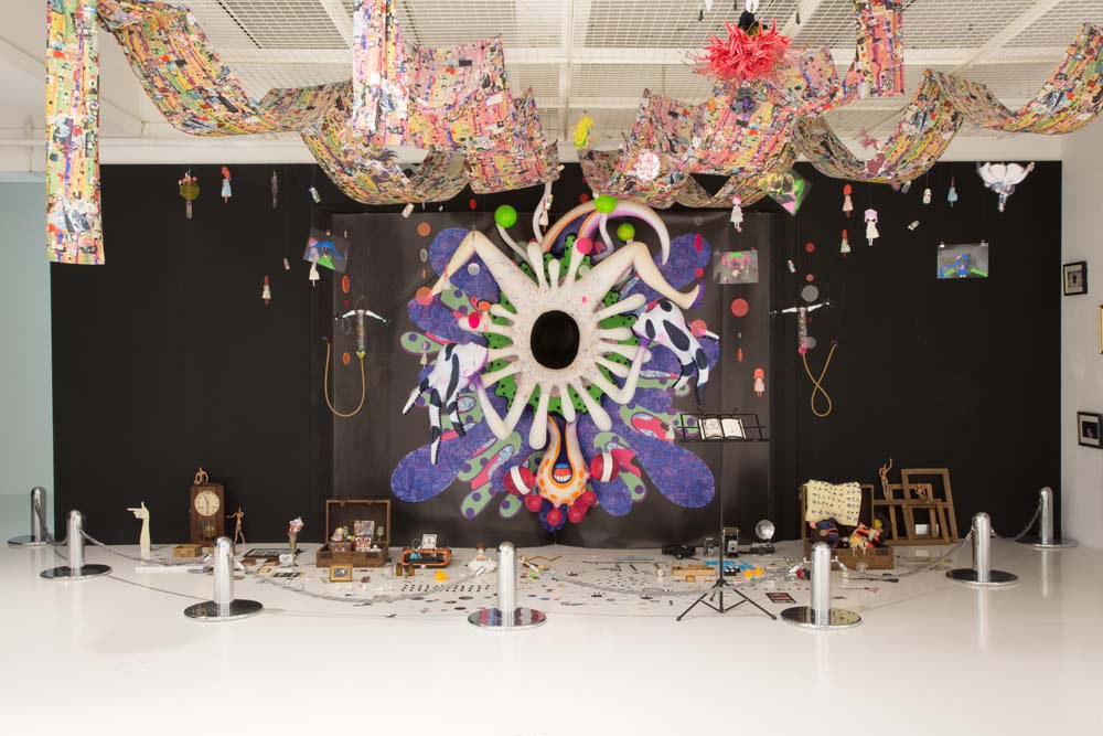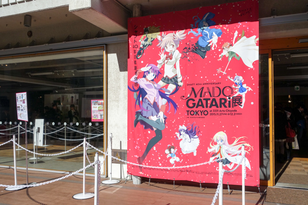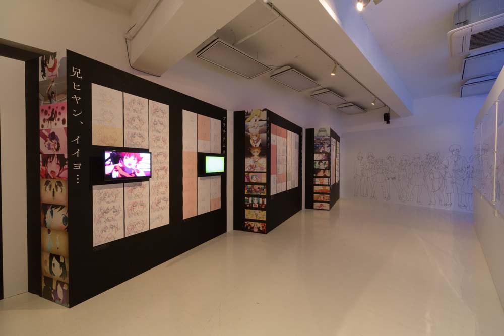 Войдя в выставочный зал центра Arts Chiyoda 3331, первое что видит зритель — это тоннель из персонажей, которых мы знаем по аниме студии Shaft.