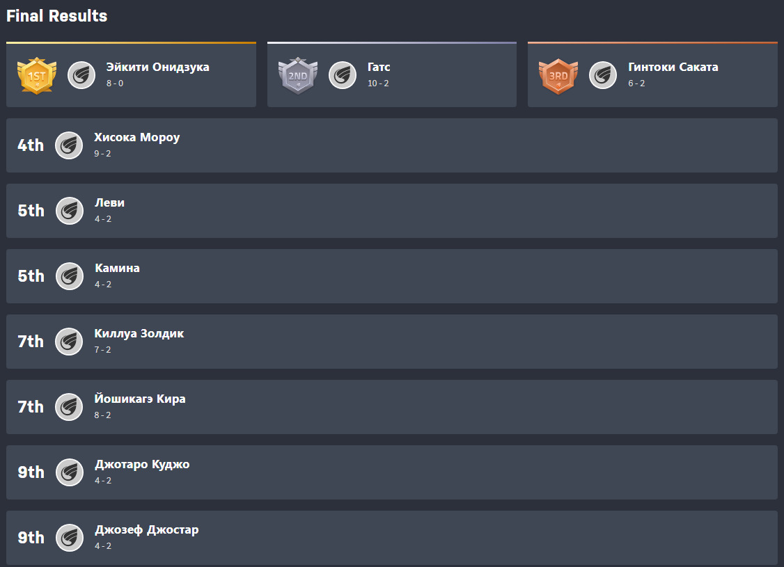@Quattro Bajeena@18271781838@DaHank, и здесь Онидзука победил.@DaHank@18271781838, Слишком хорош, думал может хоть в этом году подвинут, но не судьба@kolisya@DaHank, мда теперь обезьяна победит тень Кирито@DaHank, просто надо было заканчивать, когда лидировал Гатс@DaHank@kolisya, Это было бы нечестно)@kolisya@DaHank, а сколько дней длилось последнее голосование? Не дольше остальных, а? *ищет подвох@DaHank@kolisya, Мне просто было лень, поэтому последние голосование было дольше)@kolisya@DaHank, ай-на-нэ@DaHank@kolisya, С общим интересом упал и мой, по этому Я и не хотел делать турик в таком формате, уж больно сильно интерес падает на дистанции@kolisya@DaHank, это да, даже твинки испарились.@DaHank@kolisya, А вот это единственный плюс такого формата, когда всякие поехавшие отсеиваются по путиЖаль, боты испортили все, ну да ладно.