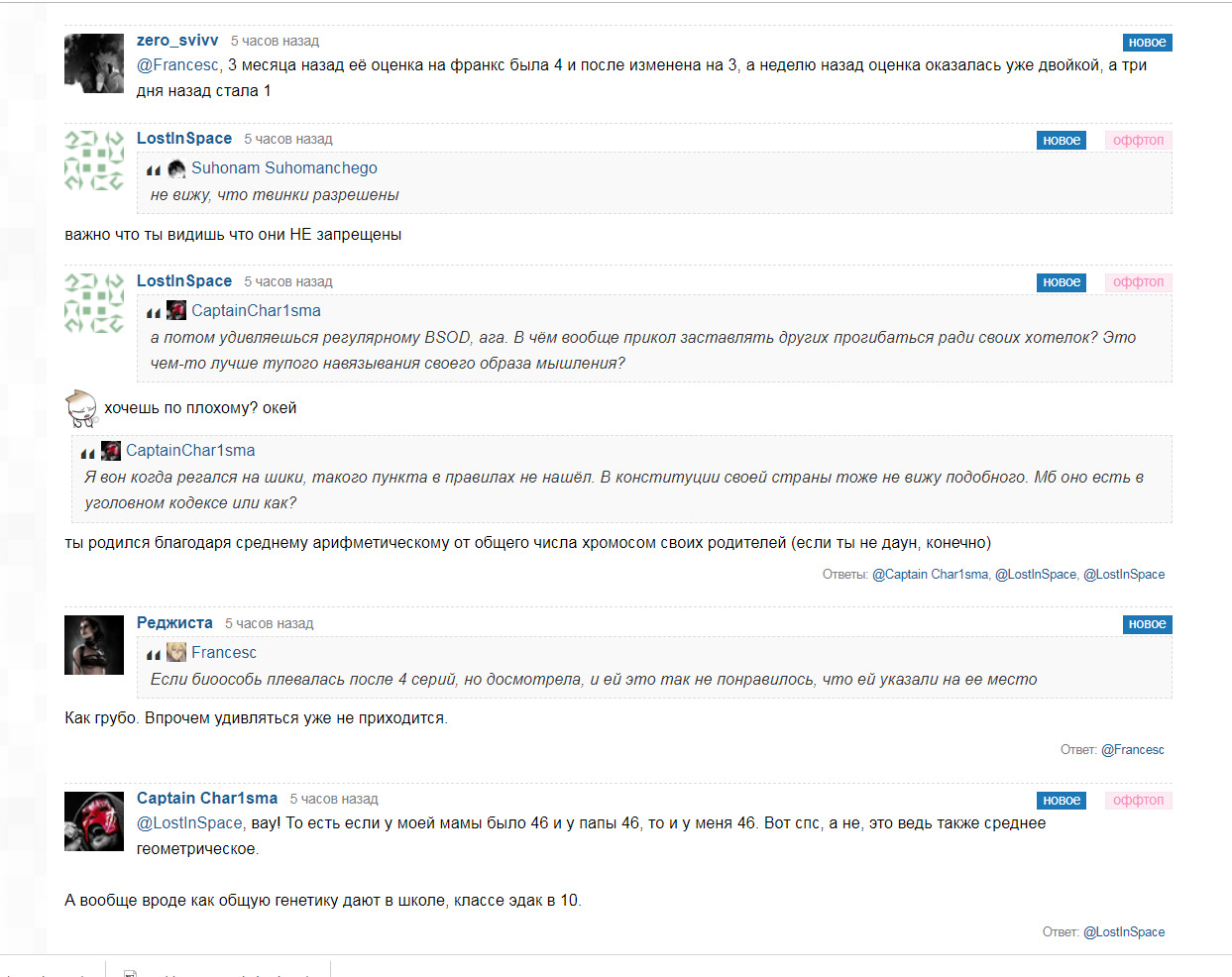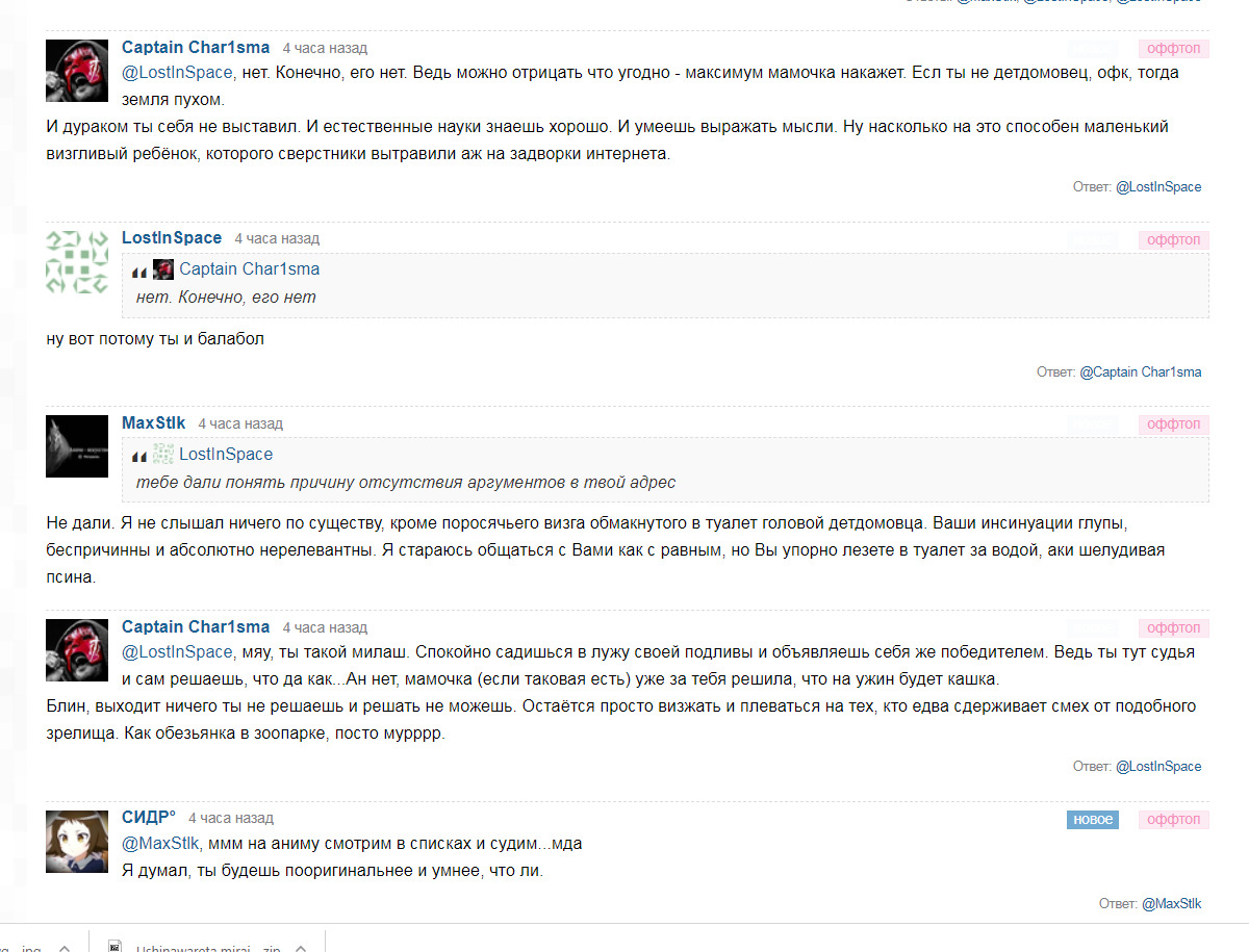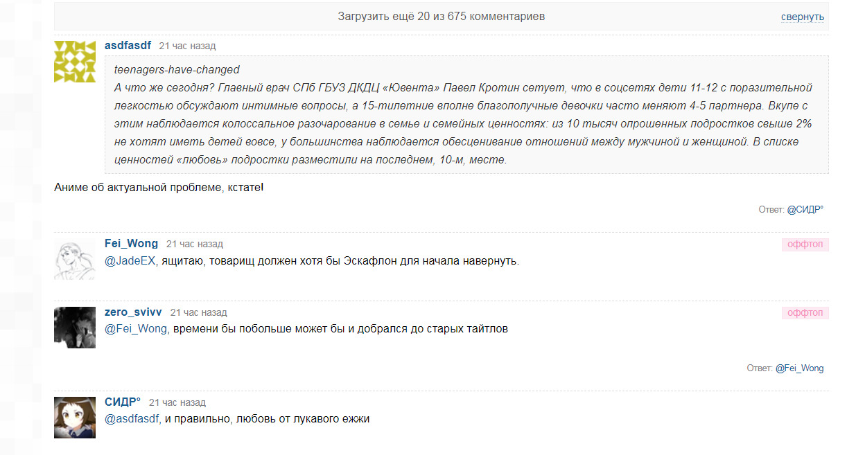 Более того, обсуждение рецензии давно превратилось в бесконечный поток офф-топика на самые разнообразные темы: политика, экономика, социальное неравенство и прочее, что никак не соответствует тематике сайта. Более половины комментариев вообще не относятся к "обозреваемому" материалу. Это ещё раз подтверждает, что данная "рецензия" направленна прежде всего на социальный аспект, нежели на художественную ценность аниме.