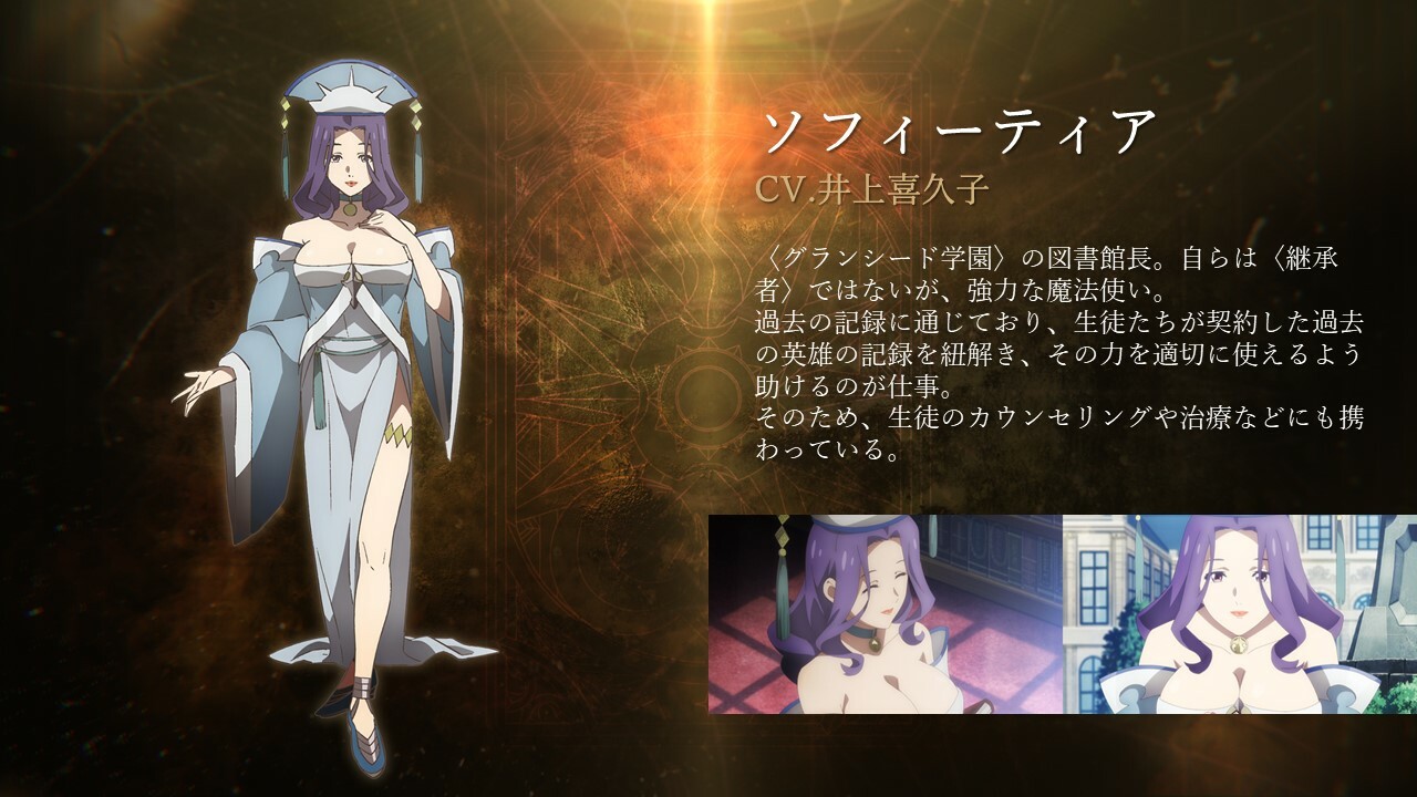 Sophitia - Софития - ソフィーティア. Сейю - Kikuko Inoue. Library director of <Grand Seed Academy>. Although he is not a "successor" himself, he is a powerful wizard. He is familiar with past records, and his job is to unravel the records of past heroes contracted by students and help them use their power appropriately. Therefore, he is also involved in student counseling and treatment.