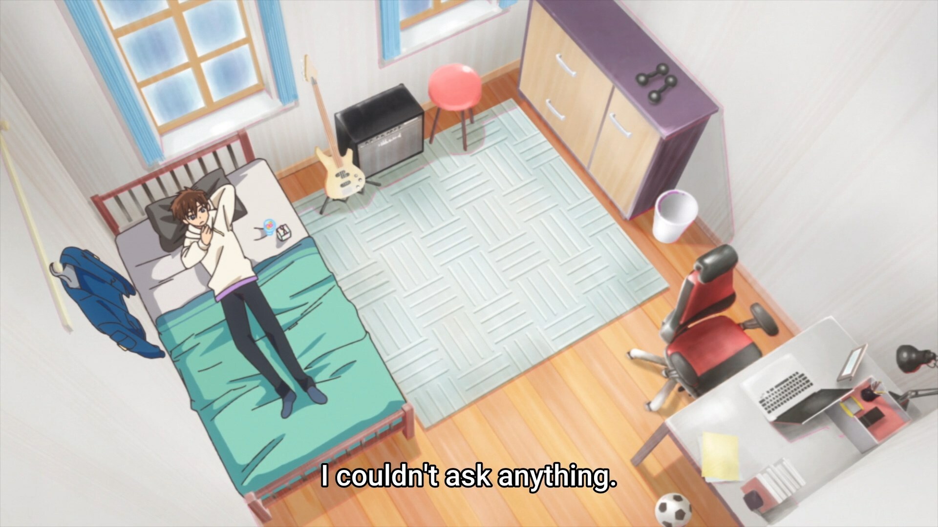 Игровое кресло и макбук? Отличное сочетание, лол. Такуми видимо часами режется в эмуляторы, а потом играет на басухе и думает о том как бы так признаться Юи.