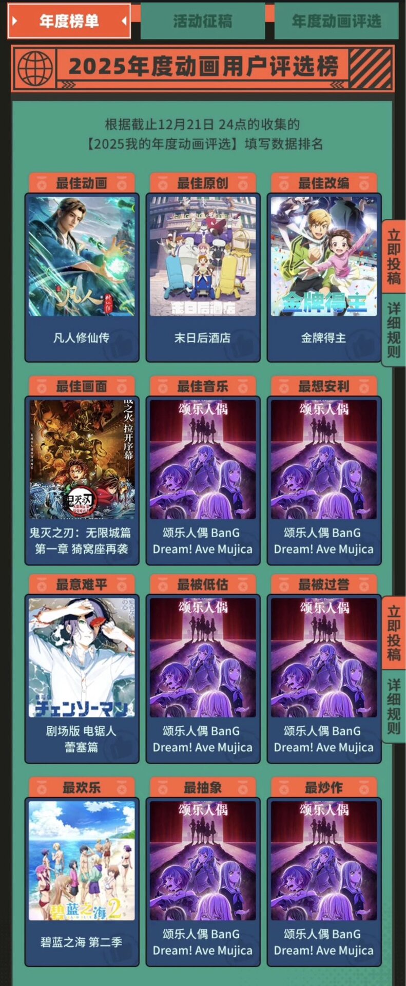 Итоги года под спойлером. На билибили муджика заняла первое место в году, наверное из-за обсуждений и большой фанбазы. Также муджика выиграла в понятных номинациях как лучшая музыка и необычных номинациях как переоцененное и недооцененное аниме одновременно. Помимо этого Сакико, Уика. Анон, Томори и Муцуми попали в топ 10 персонажей