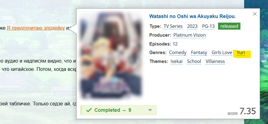 @Afotor@штошка@Aeu, всему своё время, мой юный падаван, всему своё время)@Maxemad, ну пока выходить неначело, такшто не зашло, и может все ещё будет прилично и её и неудалят@Maxemad@ShadLimited,@Afotor@ВлаDiCK010, магия@ВлаDiCK010, а вот так, запретный тэг! Вообще прикольная у нас рейтинговая систему (Нет), к примеру лицензионные тайтлы почему-то 18+ на Кинопоиске, хотя в условной подруге детства персонажи школьники, не пьют, не курят и не убивают, та даже ЛАЙТОВЫЙ фансервис цензурят (В японской и американской версии всё норм)!@paramiha34@Afotor, вероятно рейтинг +18 ставят одни, а другим потом говорят цензурить, в свое время те, кто ставили оценку, уже не перепроверяют, но это лишь догадка@другой_мадара@другой_мадара, понятно, по описанию как седзе слайс, где от юри только тег. Чисто рефлексия внутри девичьей компании. Китайцы скопировали с японщины стиль таких слайсов.@ShadLimited@Zephirus, китайщина.@Romantic@Blue cat, неееееееееееееееееееееет@штошка, тут любой седзе ай удаляют, буквально жанр пустой в поиске