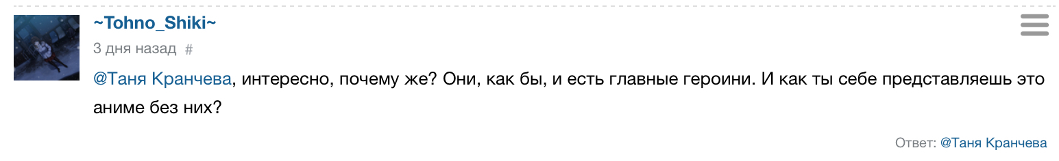 @Руслан Алиев2, Из всех пяти групп - ПП самые скучные.Их, наверное, и сделали первой и основной группой лишь потому, что они безликие и никого не раздражали, а уже потом выбрать себе по вкусу группу из остальных четырех@~Tohno_Shiki~@Таня Кранчева, но это не отрицает того, что главные герои - это они@krnch@Руслан Алиев2, говно осталось говном, а это значит, что все в порчдке@~Tohno_Shiki~@Таня Кранчева, не понимаю, зачем тебе здесь доказывать своё ИМХО, но мне кажется, что со стороны это выглядит, кхм, дебильно...@krnch@~Tohno_Shiki~, согласен, тоже не понимаю, зачем я тут доказываю свое имхо, даже представить не могу@~Tohno_Shiki~@Таня Кранчева, вопрос еа скриншоте не требовал ответа, ибо ответ итак очевиден. Так что думай дальше, удачи@Таня Кранчева[comment=4986090], если тебе плохо, могу скорую вызвать....@krnch@~Tohno_Shiki~,@~Tohno_Shiki~@Таня Кранчева, ладно, я просто проигнорирую, буду умнее, так сказать... Походу тут реально человеку плохо, а я достаю... Не по-человечески как-то...@krnch@~Tohno_Shiki~,@Rachestahl[comment=5058035], Весь «фильм» буде в 3д@Kralka@kagehina, vk.com/video-138252596_456240239@kagehina,@StasMat@Kralka, благодарю!@Kralka, кроме вк фильм где нибудь есть?@Kralka,@ミラベラ@StasMat, если только на трекеры кто-нибудь не поленился слить@StasMat, а в вк где? Я просто нигде найти не могуНо концовка милая