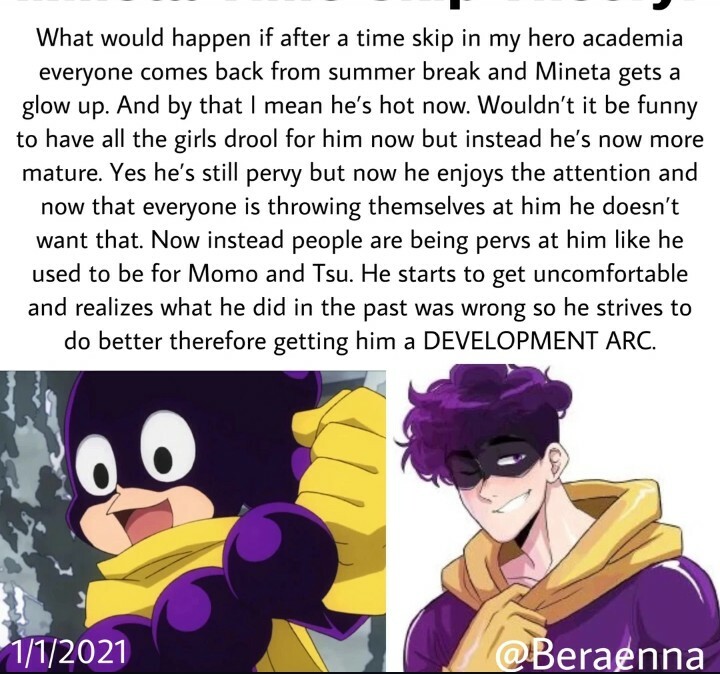 Что произойдет, если после перерыва в my hero academia все вернутся с летних каникул, и Минета засияет? И под этим я подразумеваю, что сейчас он горяч. Разве не было бы забавно если бы все девушки сейчас пускали по нему слюни, но вместо этого он стал более зрелым. Да, он все еще извращенец, но теперь он наслаждается вниманием, и теперь, когда все набрасываются на него, он этого не хочет. Теперь вместо этого люди ведут себя с ним как извращенцы, как он раньше вел себя с Момо и Цу. Он начинает чувствовать себя некомфортно и понимает, что то, что он делал в прошлом, было неправильным, поэтому он стремится сделать лучше, что дает ему возможность РАЗВИВАТЬСЯ.